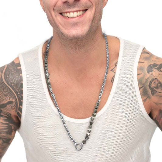 Collana Marlù unisex pietre pirite e catena sonaglio e rolò