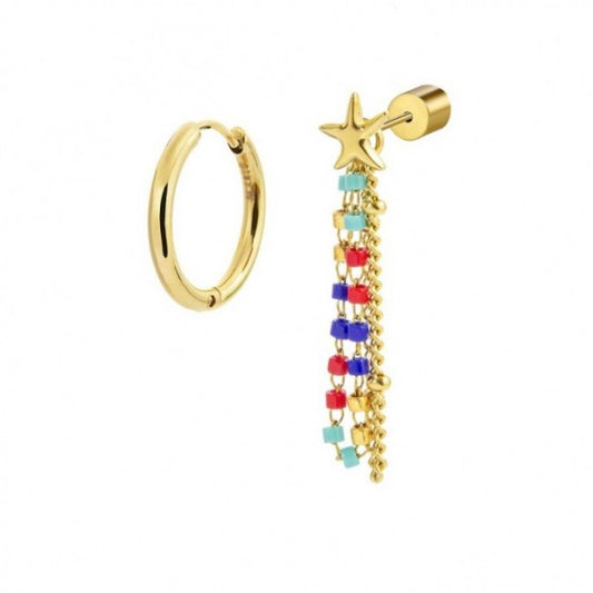 MONO ORECCHINO MULTINDOSSO CERCHIO CON DOPPIA CATENA MIYUKI MULTICOLORE PVD ORO