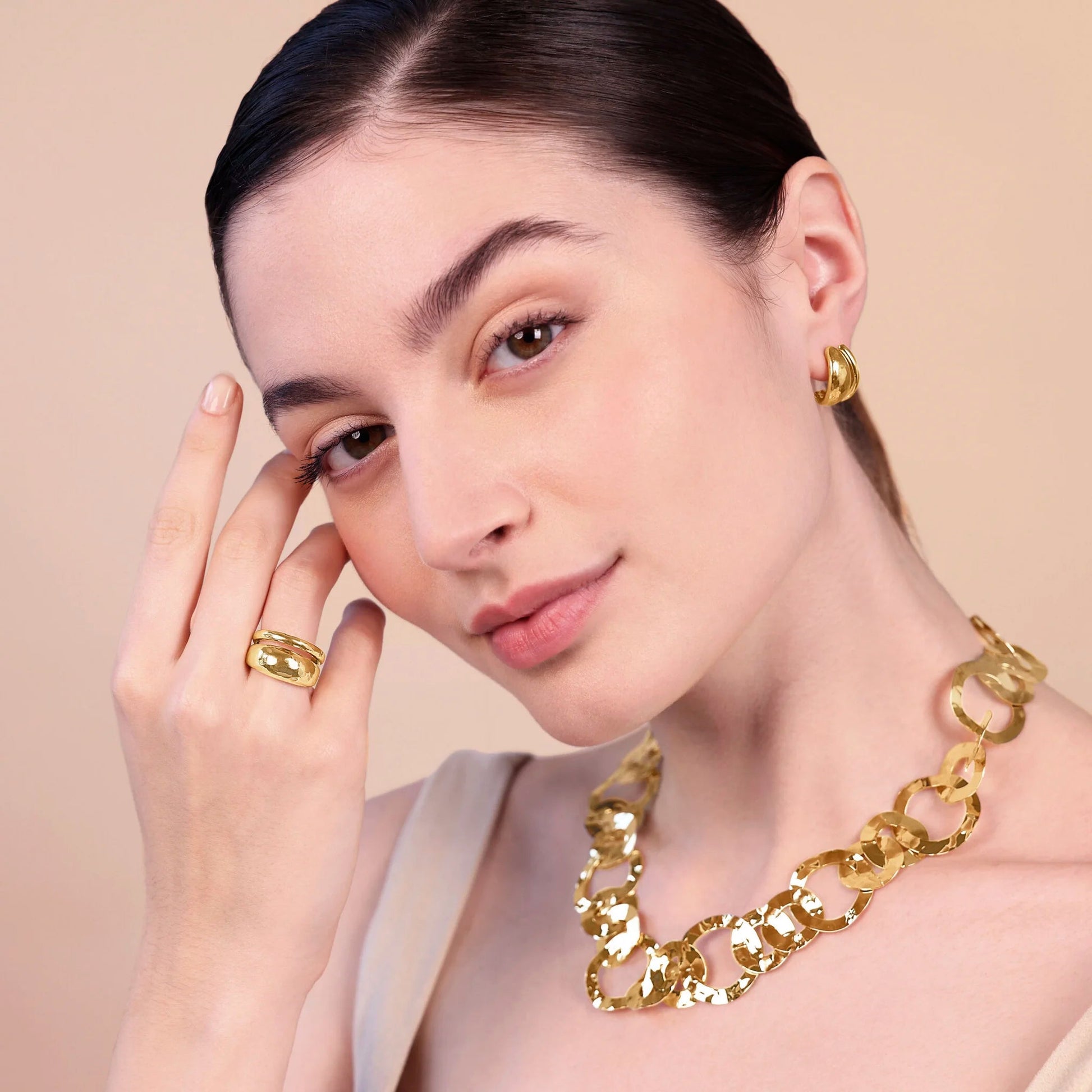 Anello a fascia Etrusca Gioielli realizzato in lega Golden, placcata oro giallo 18kt, con classica finitura martellata e dal design che sdoppia il prodotto in indossato come se si trattasse di due pezzi sovrapposti.