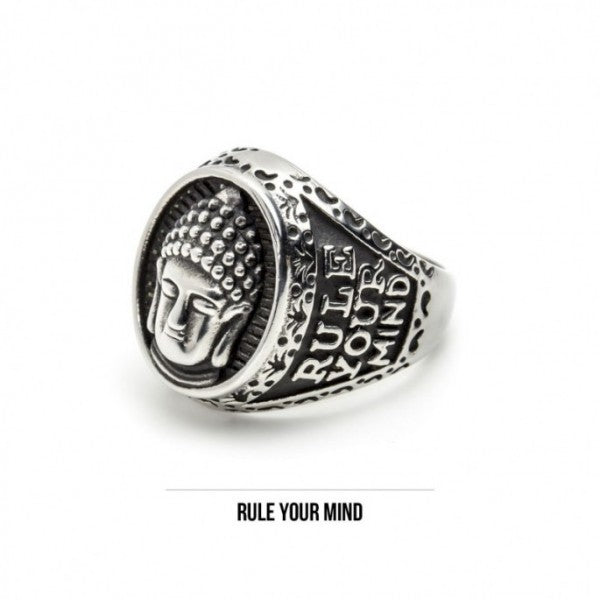 Anello in acciaio di forma ovale rappresentante il Buddha. Collezione Namastè 01. Materiali : Acciaio.