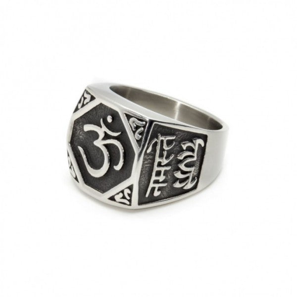 Anello in acciaio di forma quadrata rappresentante Ohm. Collezione Namastè 01. Materiali : Acciaio.