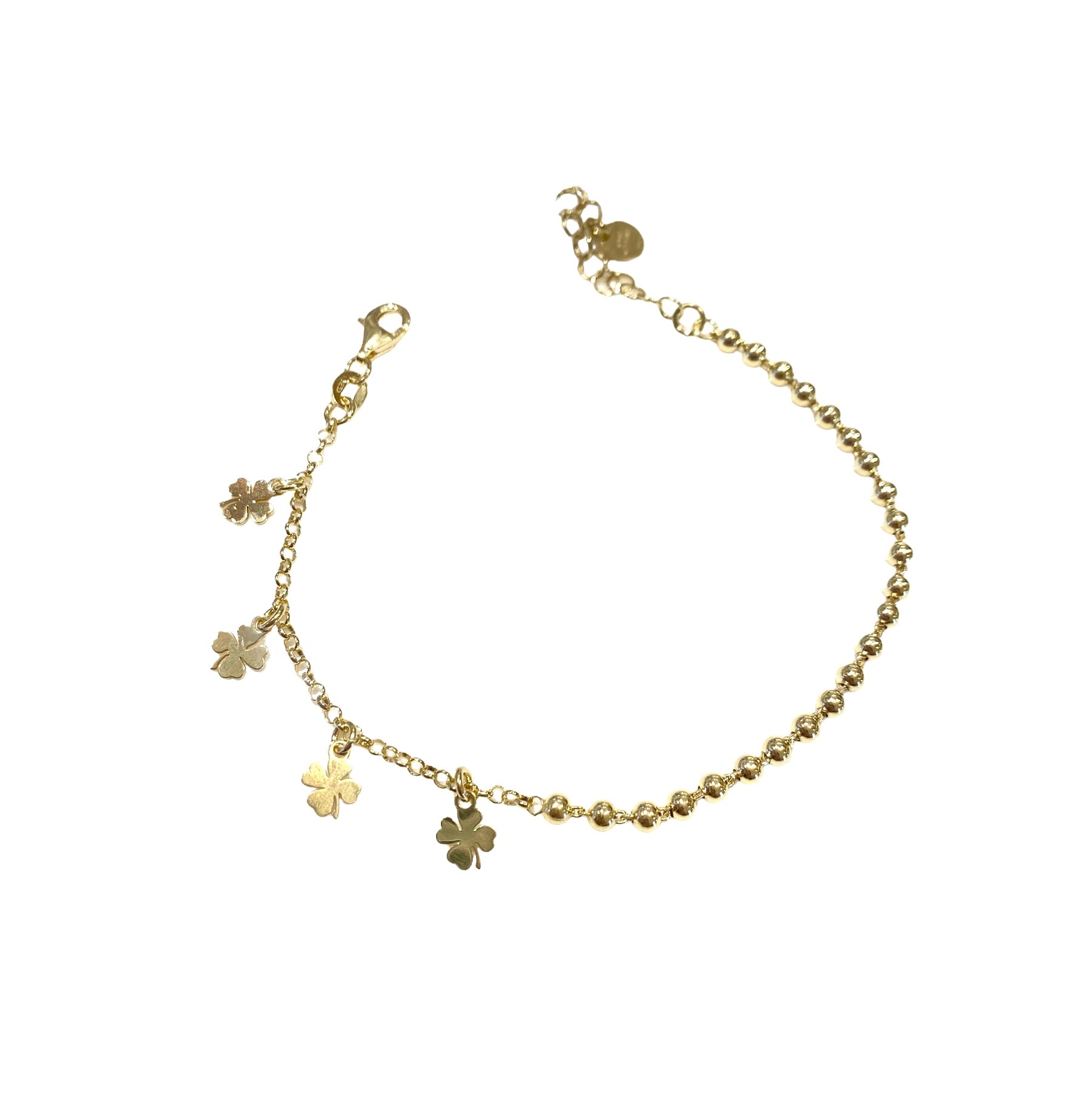 Bracciale in argento 925,con sfere e quadrifogli pendenti bagno oro