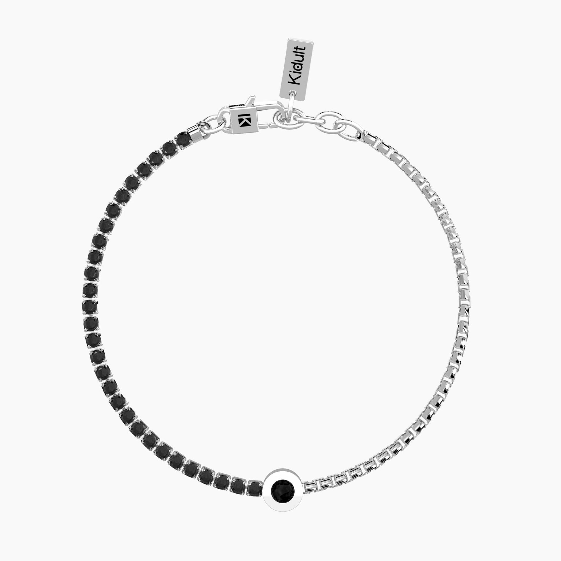 Bracciale tennis da uomo con catena veneta in acciaio e cristalli neri con zircone nero centrale.
