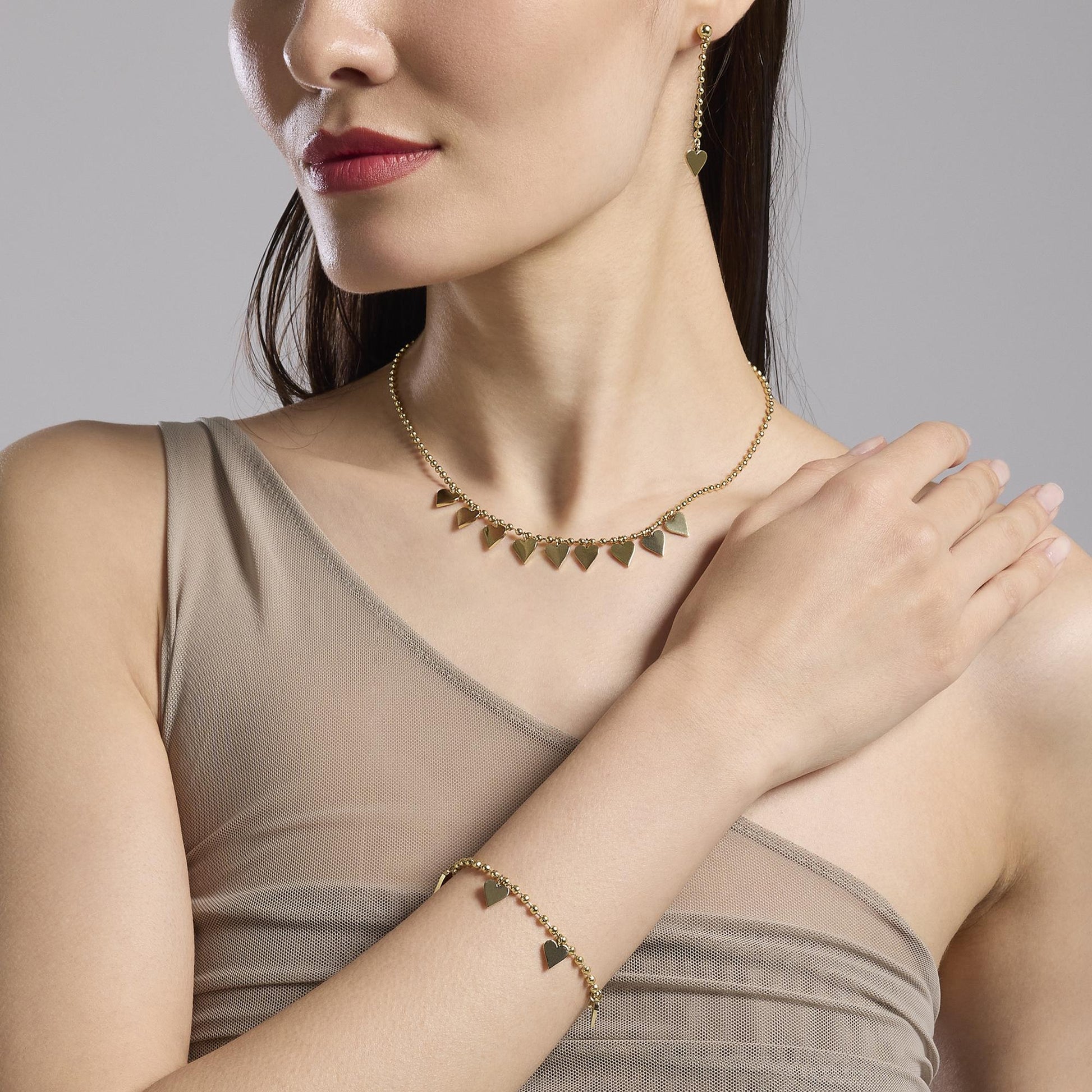 Bracciale con catena a sfere e ciondoli cuore in acciaio dorato.