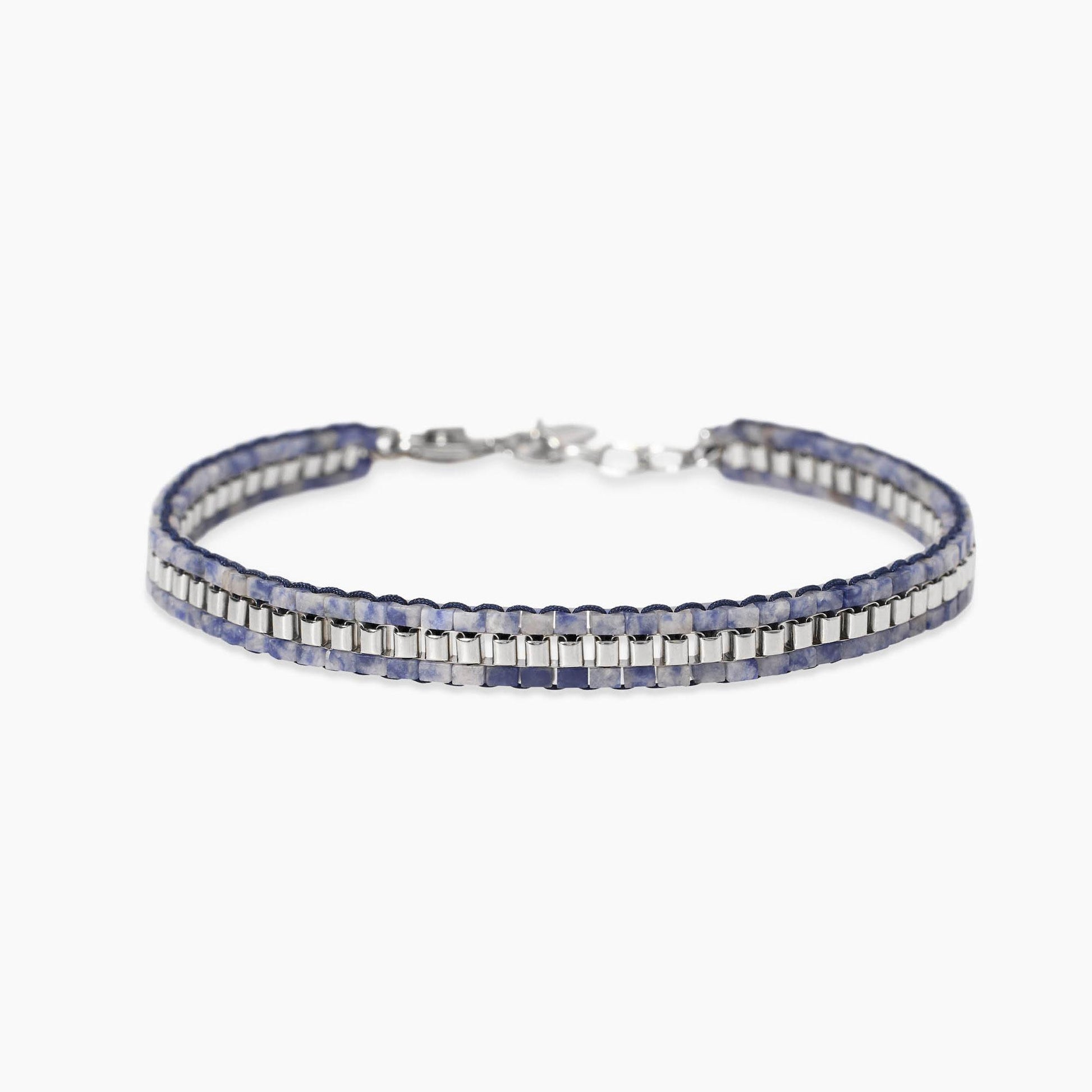 Bracciale regolabile in acciaio con catena veneta, nylon blu e diaspro blu striato sezione quadrata.