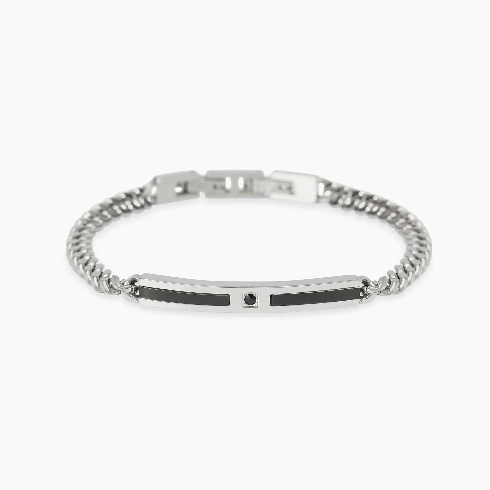 Bracciale regolabile in acciaio lucido e satinato con catena groumette satinata e spazzolata. Piastra centrale nera con cristallo.