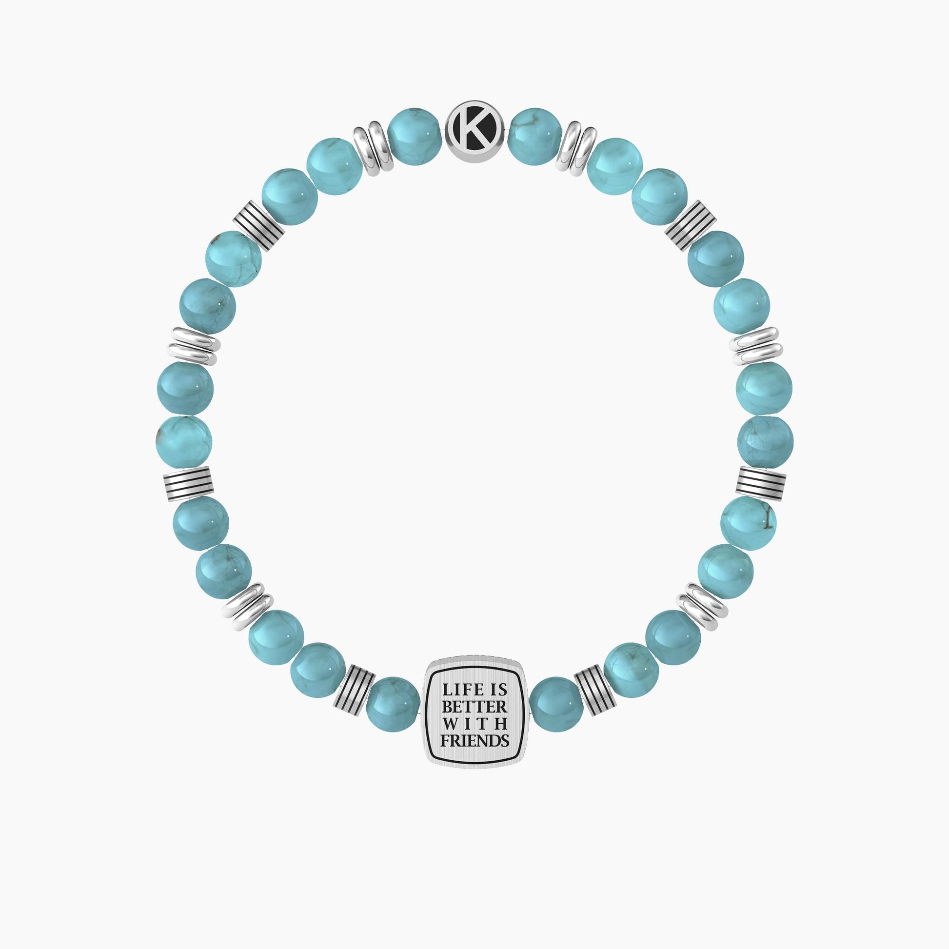 Bracciale elastico con sfere in turchese alternate a cilindri rigati e anelli in acciaio, con piastra satinata quadrata con retro nero.