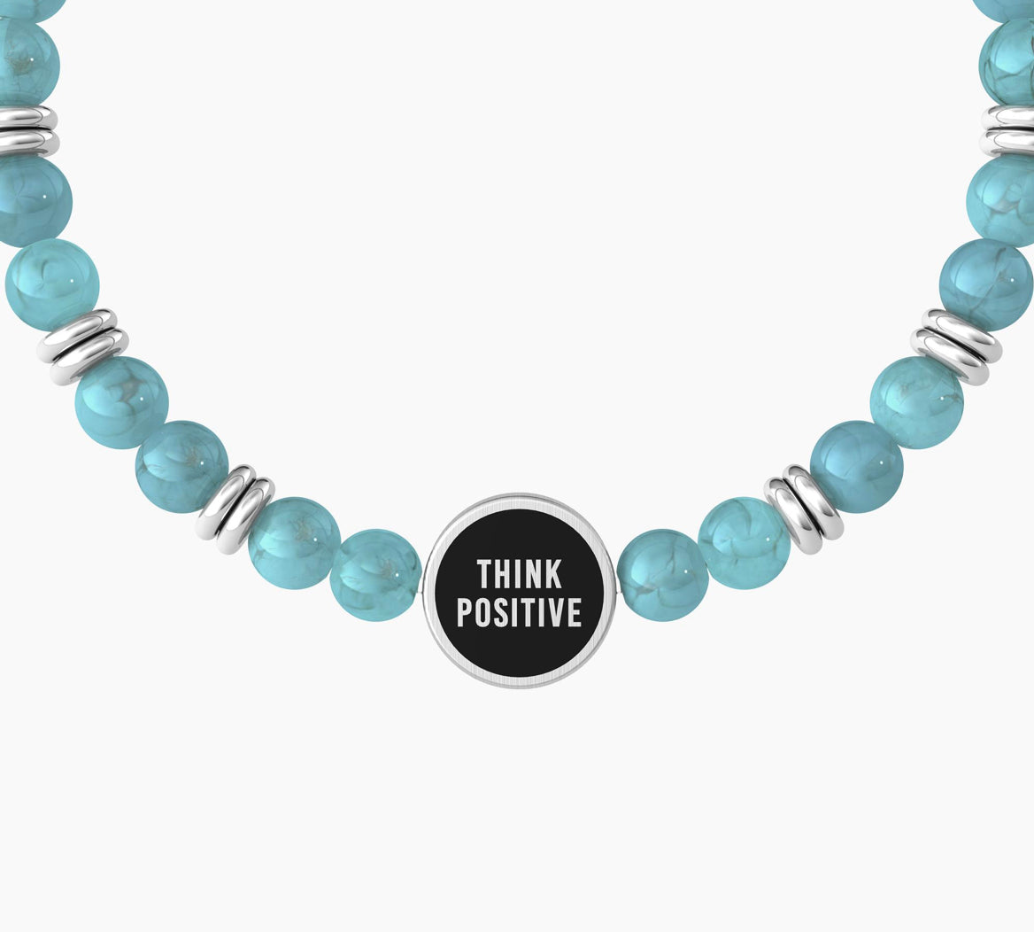 Bracciale elastico con sfere in turchese e ciondolo tondo con simbolo OM e bordo nero sul fronte e incisione "Think Positive" sul retro.
