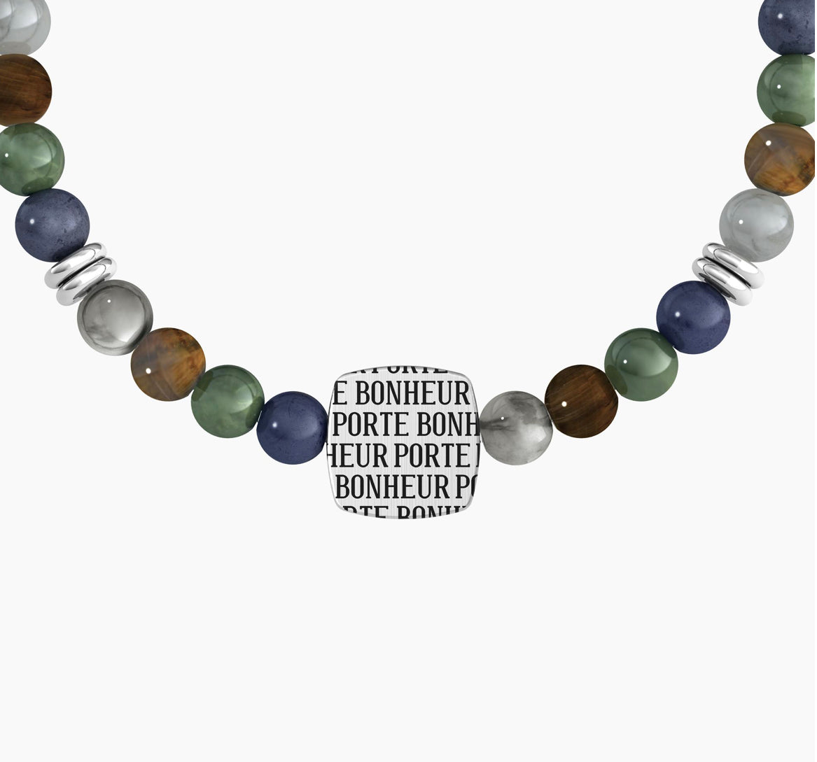 Bracciale elastico con pietre alternate multicolore e anelli in acciaio. Elemento quadrato con cornetto portafortuna sul fronte e scritte Porte Bonheur sul retro. Un gioiello di buon augurio da regalare o regalarsi.