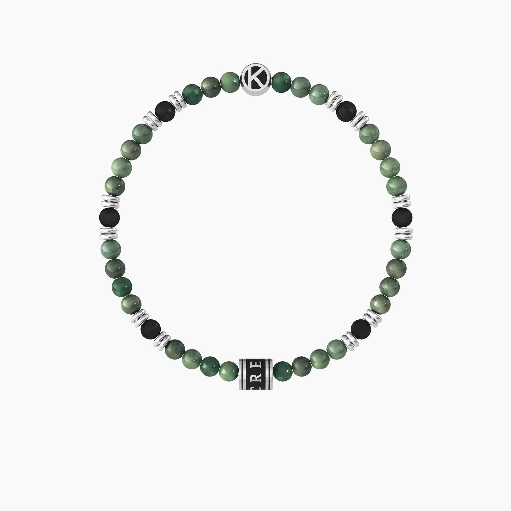 Bracciale elastico con pietre in agata nera alternate a pietre in giada verde e charm in acciaio con scritta "Credici".