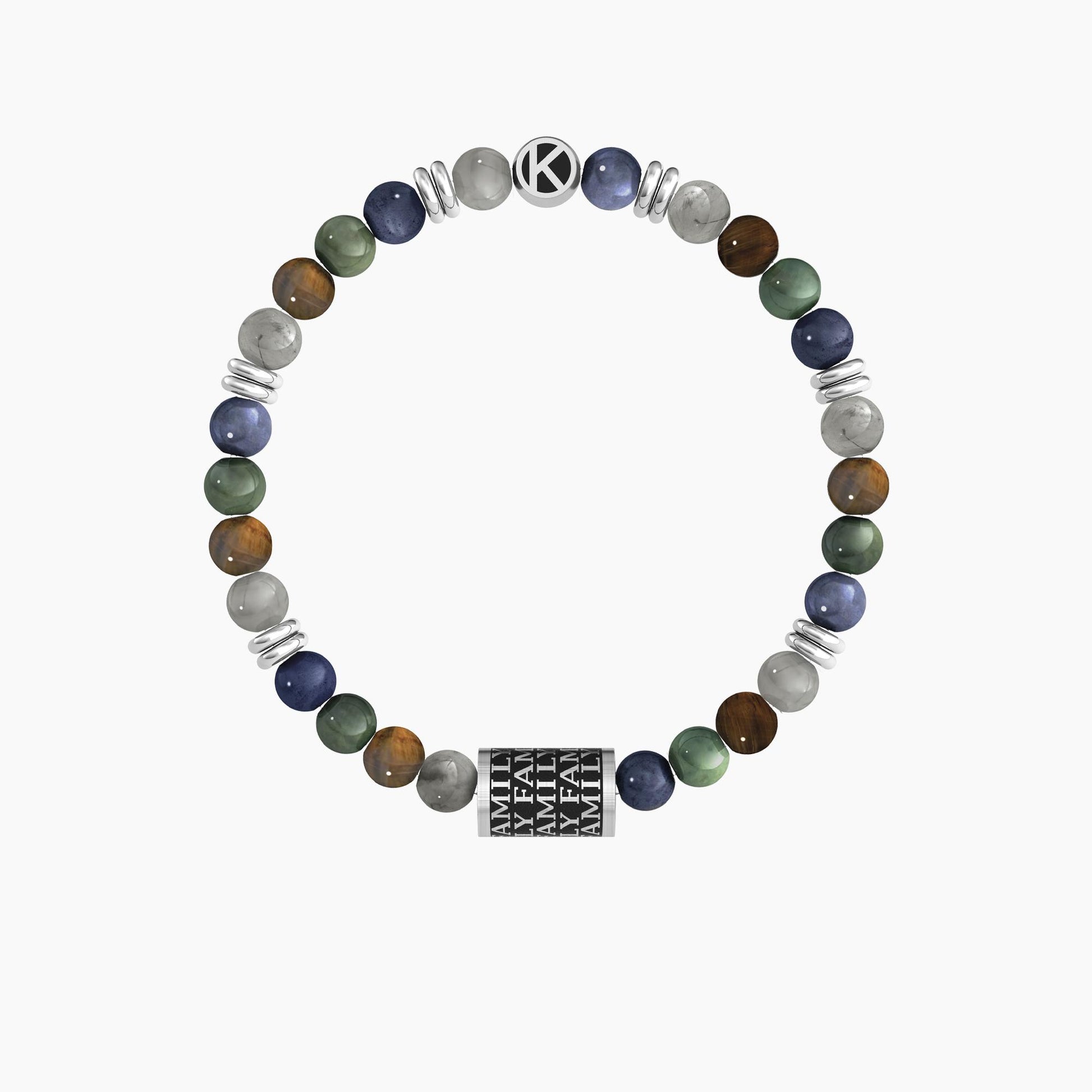 Bracciale elastico con pietre multicolor e charm in acciaio con scritta "Family".