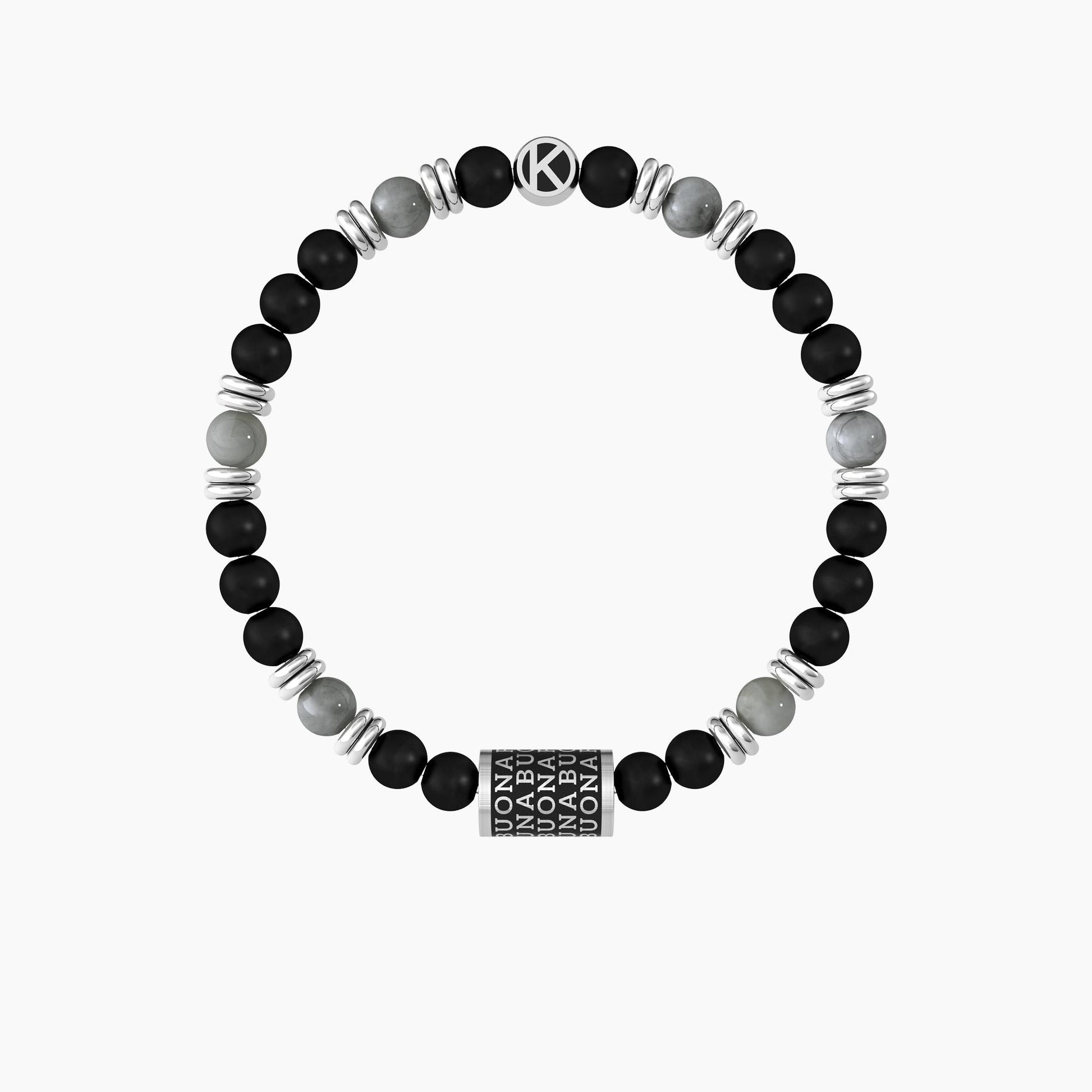 Bracciale elastico con pietre alternate in agata nera e agata grigia alternate e charm in acciaio con scritta "Buona fortuna".