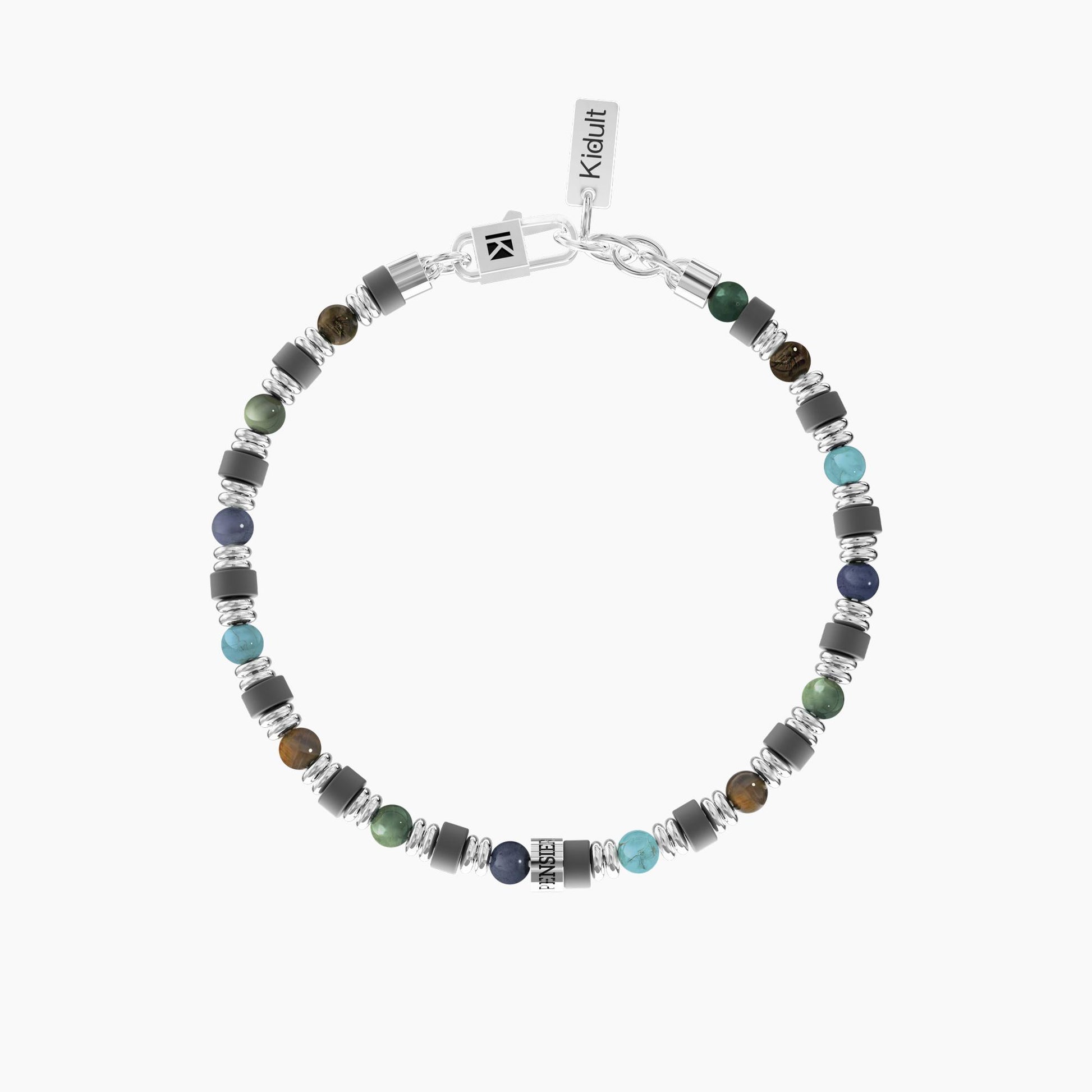 Bracciale uomo regolabile in acciaio con giada, occhio di tigre, turchese, sodalite blu, ematite taglio cubico e scritta "Vivi senza pensieri".
