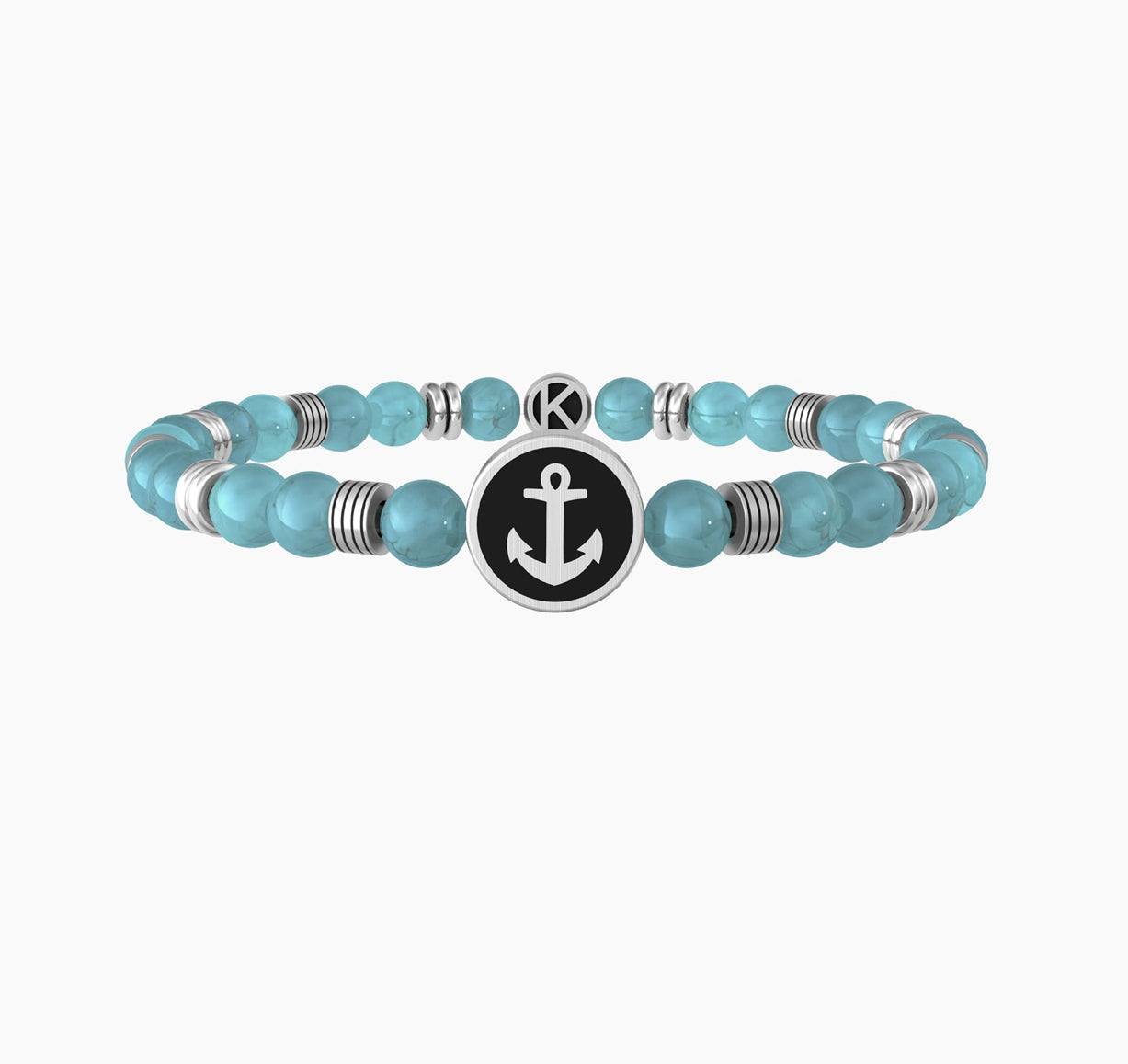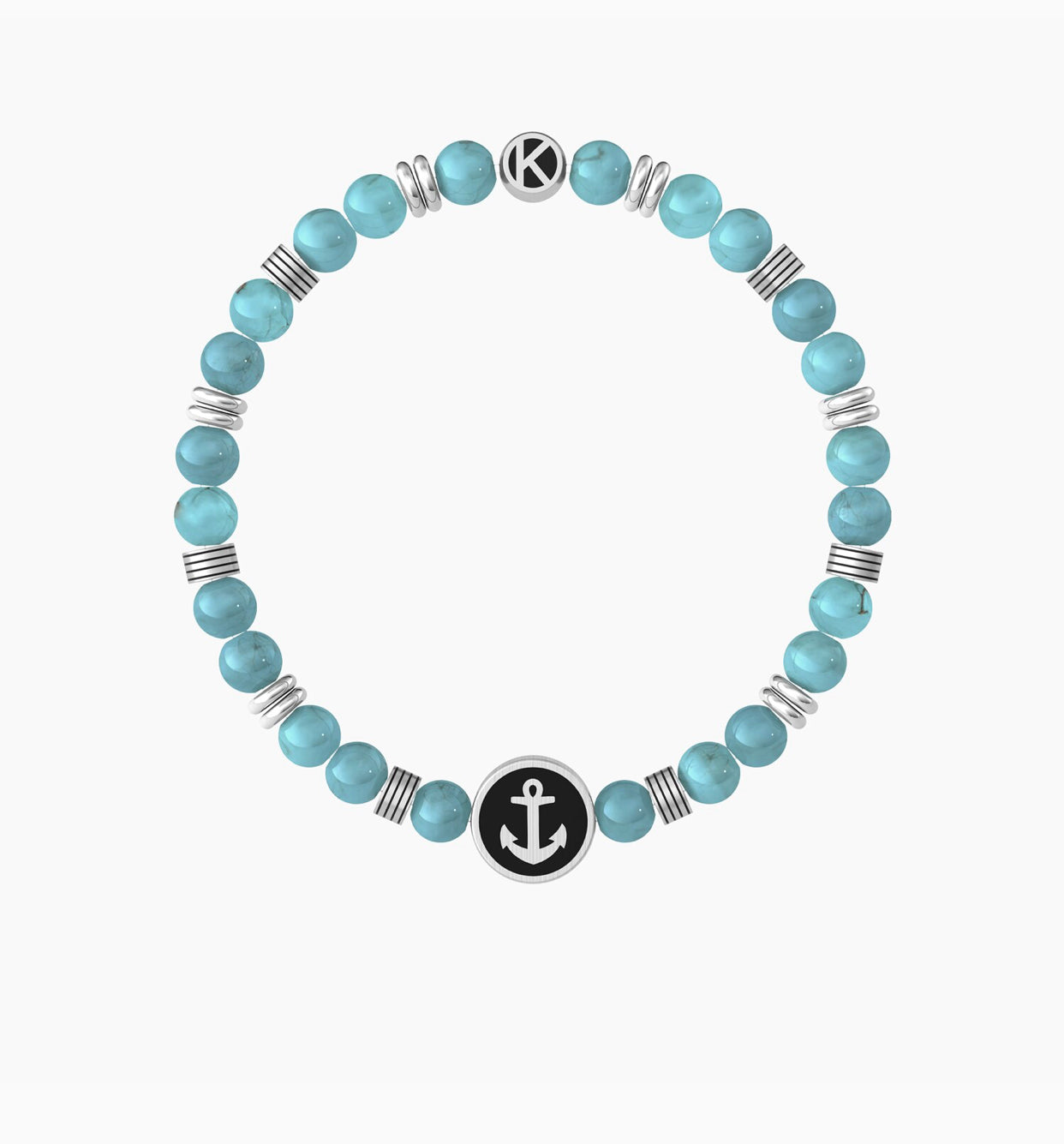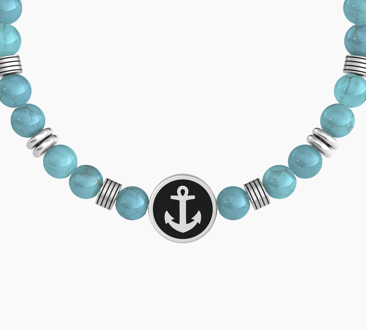 Bracciale elastico in acciaio con cilindri e anelli alternati a sfere in turchese, con piastra centrale satinata tonda nera con ancora.