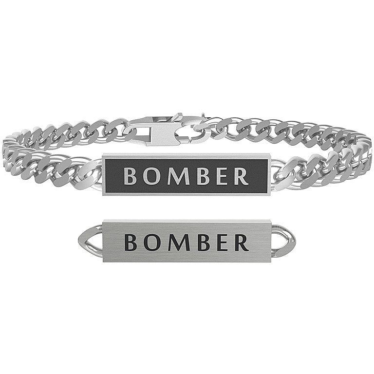 Bracciale in acciaio satinato con catena groumette e piastra rettangolare di colore nero.
