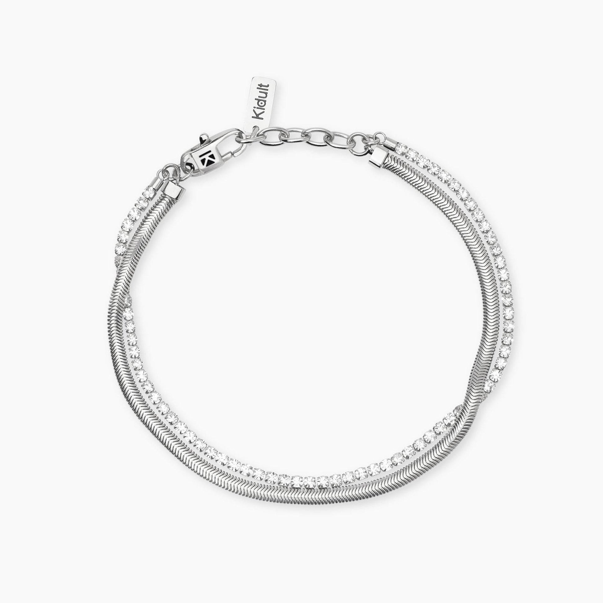 Bracciale regolabile con catena snake in acciaio e catena tennis di cristalli bianchi.