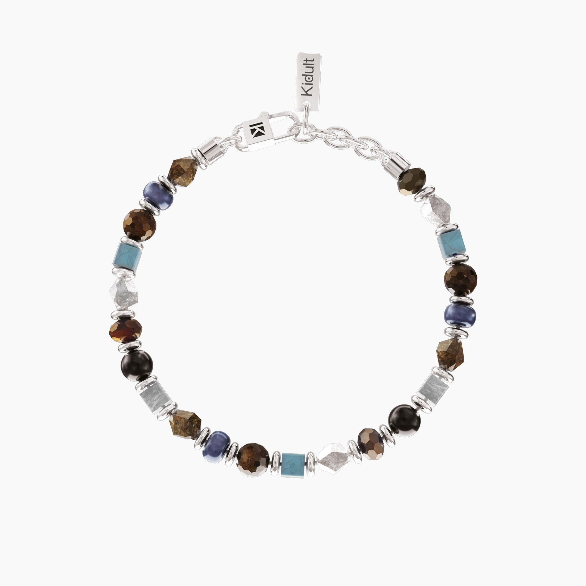 Bracciale uomo regolabile in acciaio con agata nera, sodalite blu, turchese, agata grigia striata taglio cubico, agata grigia striata e occhio di tigre faccettati.