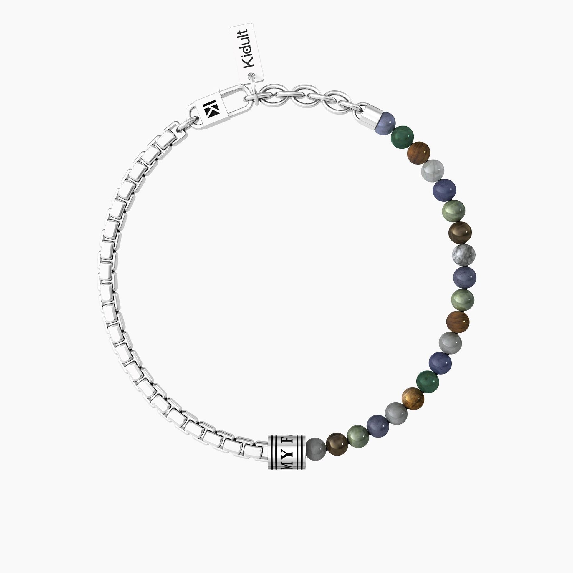 Bracciale regolabile Famiglia da uomo in acciaio per metà con catena veneta e per metà in pietre naturali multicolor con elemento con scritta "My family".
