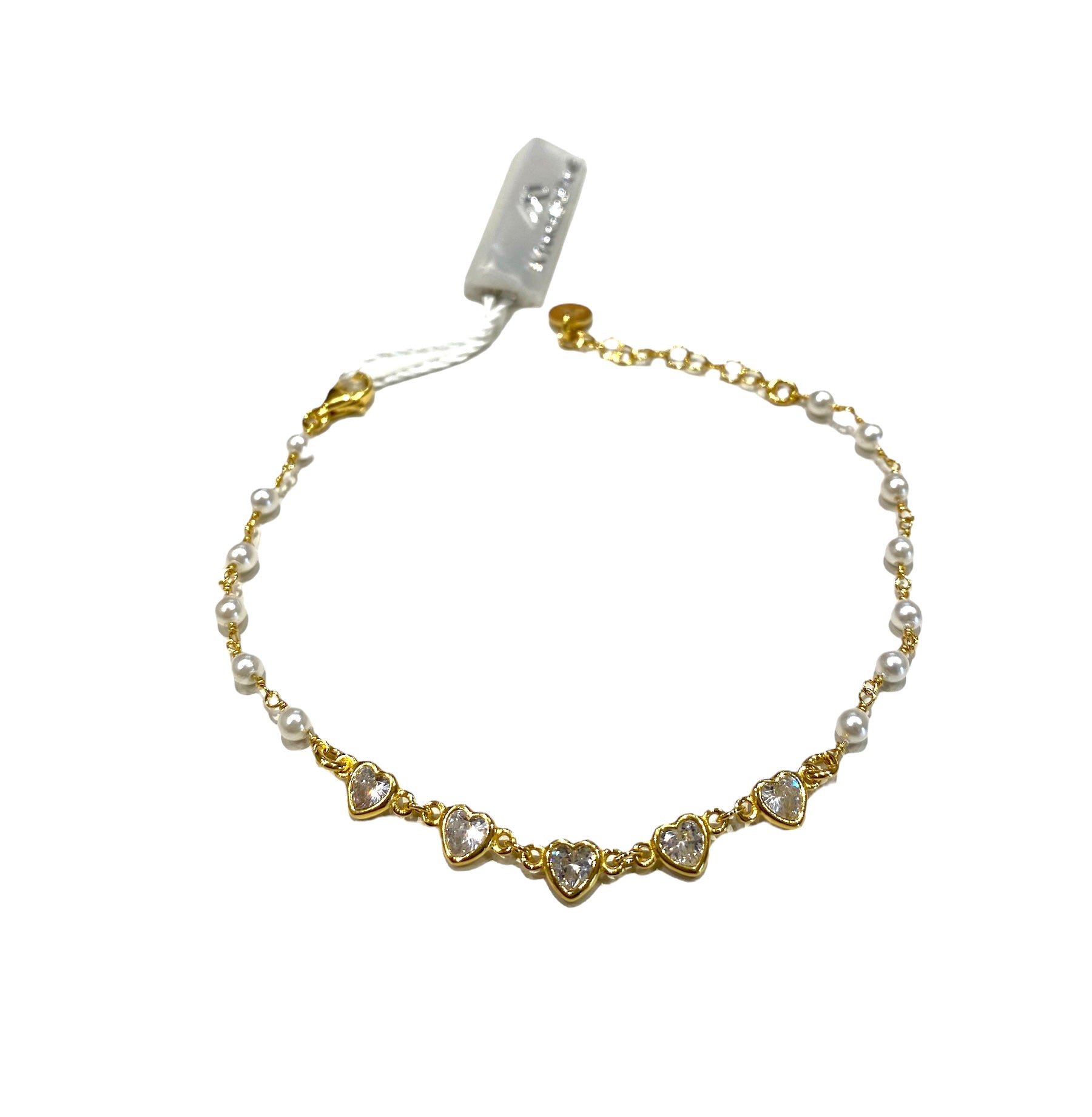 Bracciale in argento 925 con bagno in oro giallo, caratterizzato dalla presenza di perline e cuoricini con zirconi nella parte centrale.