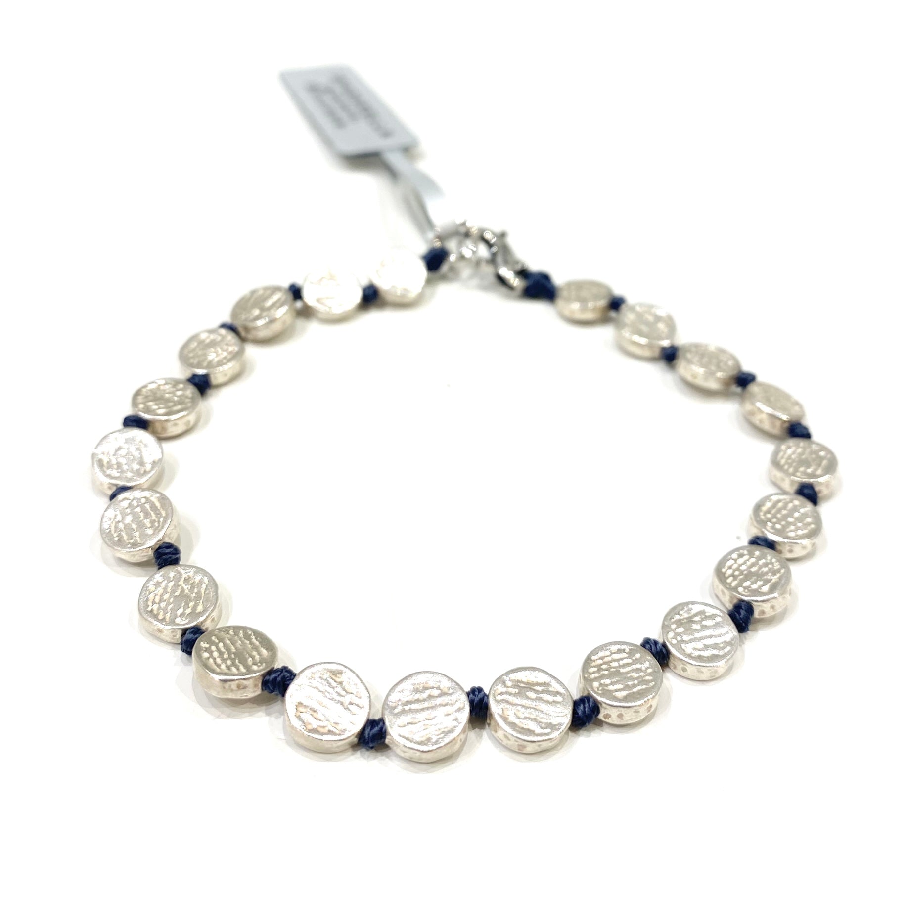 Bracciale con cordoncino,monetine spazzolate in argento e nodini