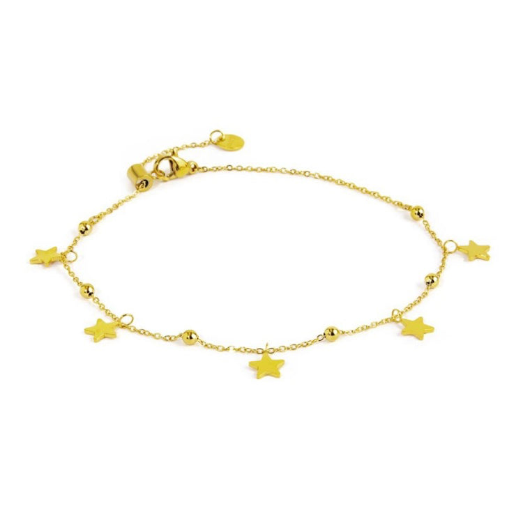 Cavigliera in acciaio con pvd oro con catena con stelle pendenti e sfere di acciaio. Lunghezza totale 25,8 cm, regolabile tramite cursore da 25,8 cm a 19,9 cm. Marlù logo tag all'estremità. Materiali: acciaio con pvd oro