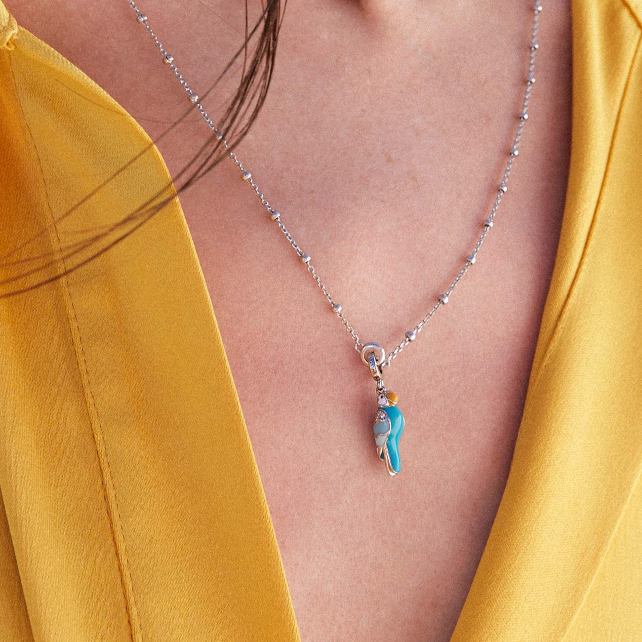 Charm in argento 925‰ a forma di pappagallo, smalti colorati, 19 cubic zirconia bianchi