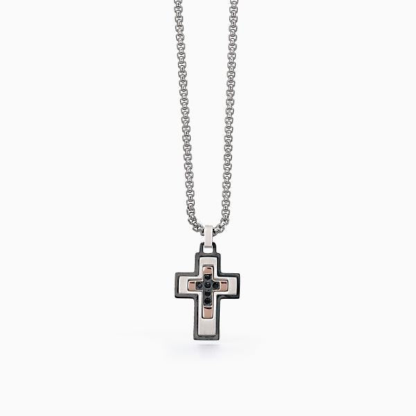 Girocollo in acciaio 316L con catena veneta 1.5 mm, pendente croce 15x20 mm con PVD nero e rosé e cristalli Ø 1 mm, lunghezza 50 cm
