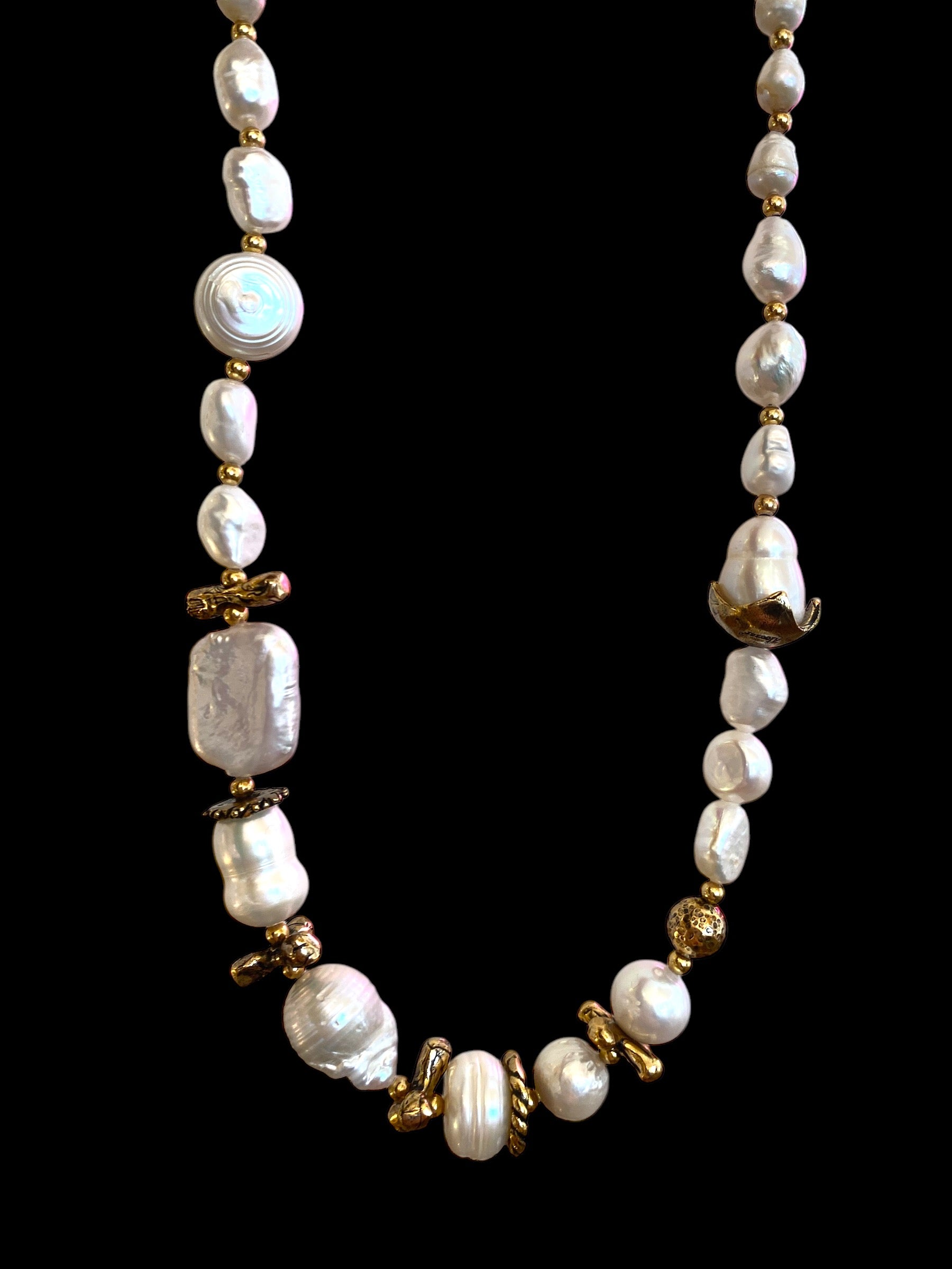 Collana in ottone dorato, pezzo Unic,con perle scaramazze ed elementi irregolari ottone bagno oro antichizzato