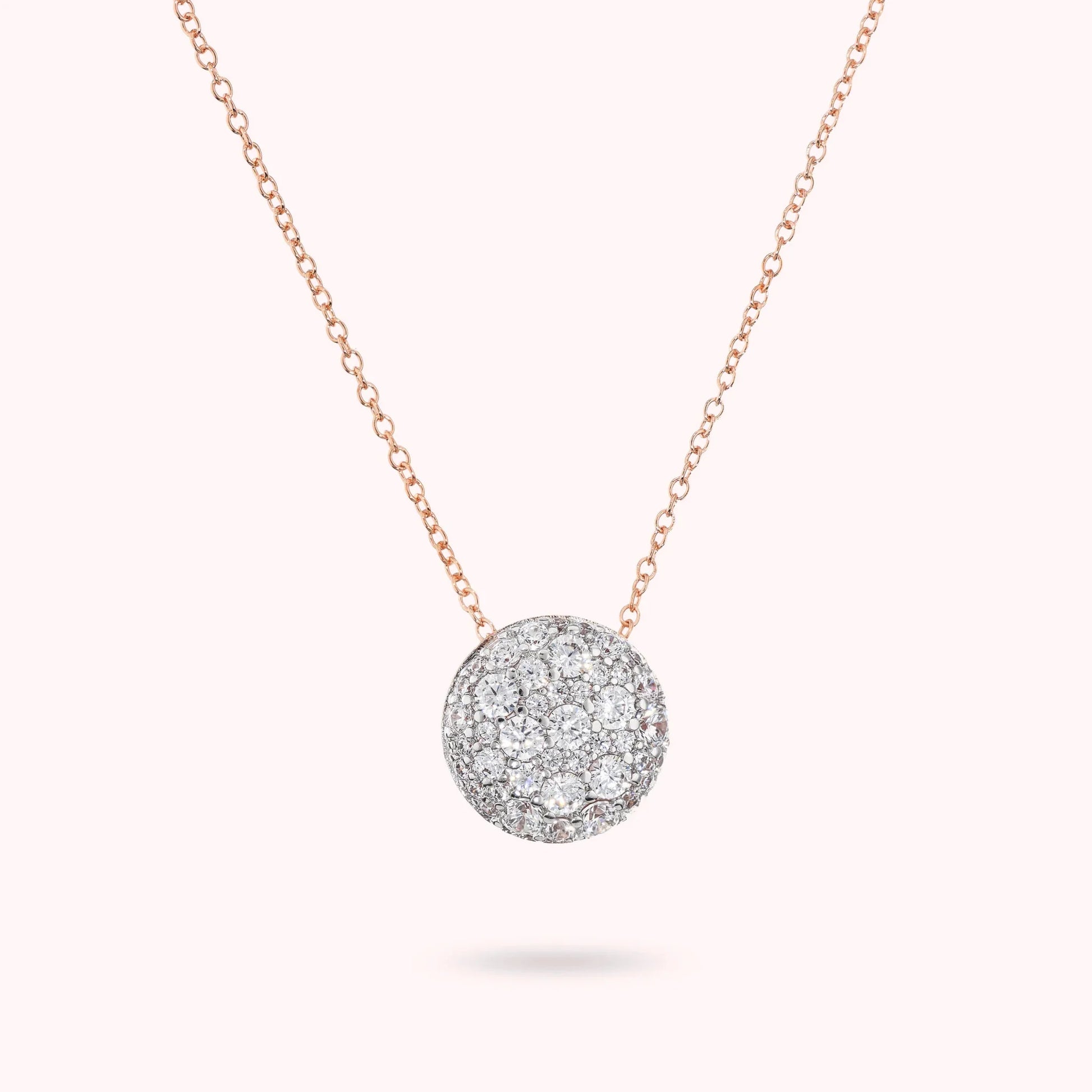Collana Bronzallure realizzata in lega Golden Rosé, placcata Oro 18kt, con maglia rolo e ciondolo scorrevole a bottone (12 mm) in pavé di cubic zirconia, qualità luminosa. Chiusura a moschettone.