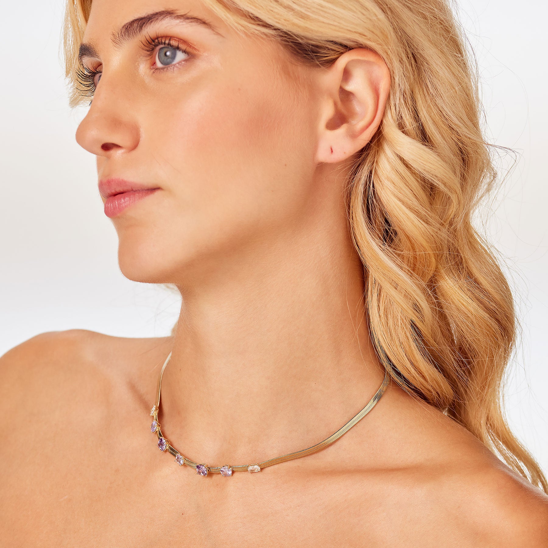 Collana girocollo in acciaio 316L e finitura pvd oro 14K, con round, cushion, square e baguette cubic zirconia colore ametista.