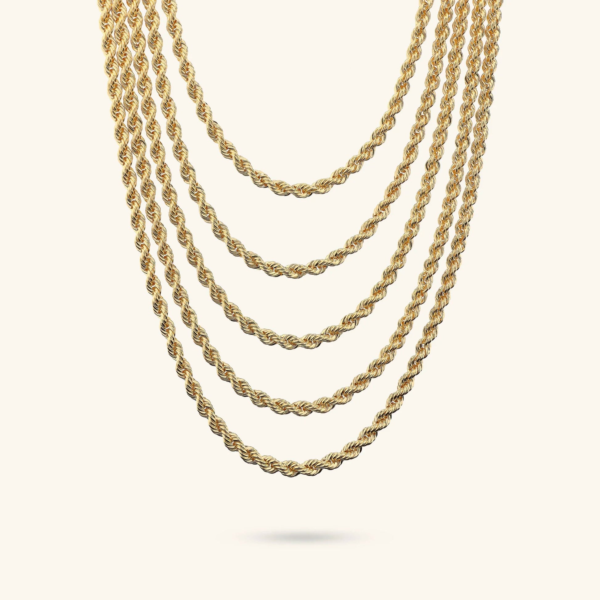 Collana multi-filo Etrusca Gioielli realizzata in lega Golden, placcata Oro giallo 18kt, dal design graduato con maxi catena corda. Lunghezza filo più corto 40+5 cm di estensione. Chiusura a moschettone.