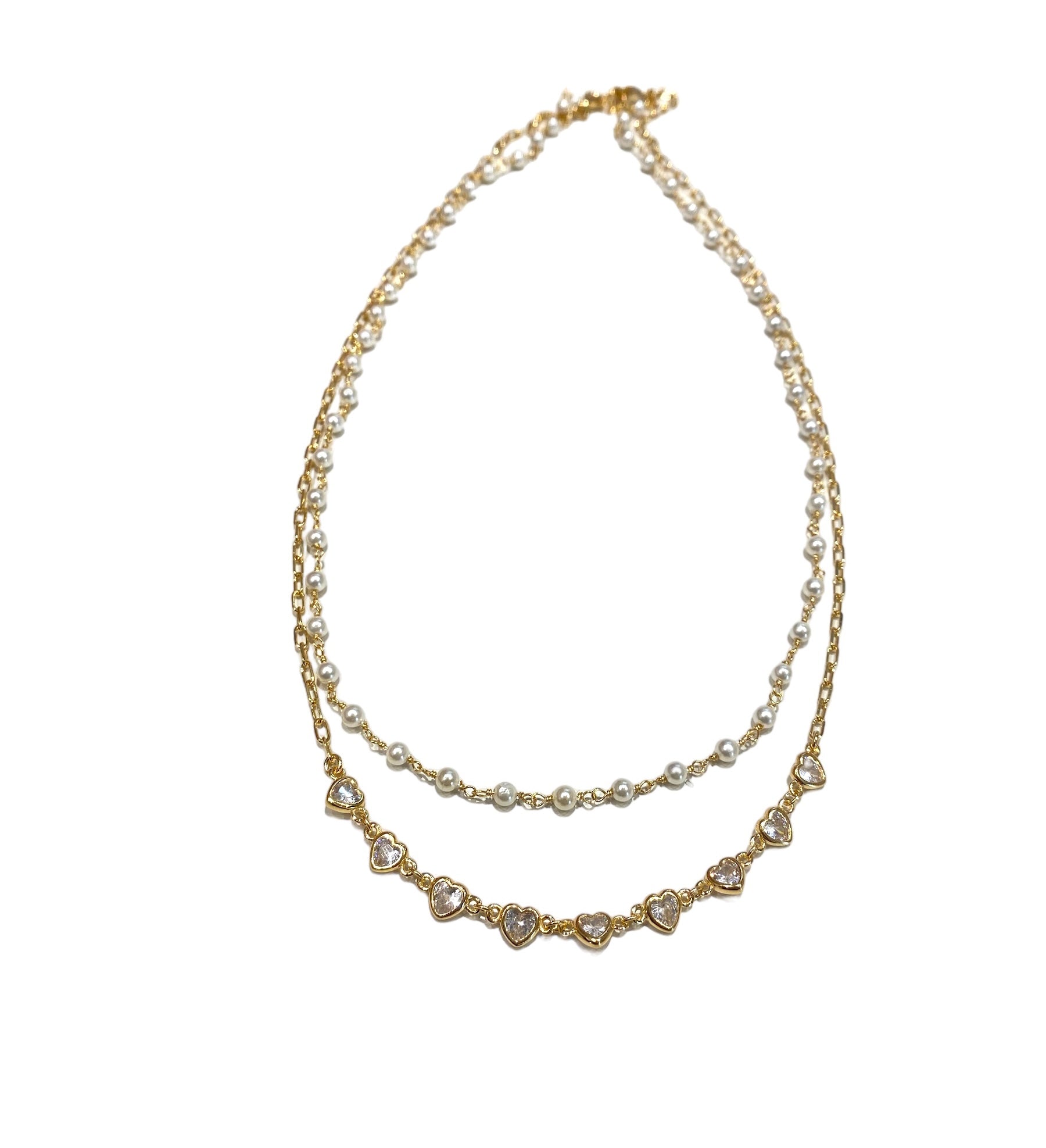 Collana doppio filo in argento925 con bagno in oro giallo, caratterizzata da una catenina più corta con perline ed una più lunga che presenta al centro dei cuoricini con zirconi.