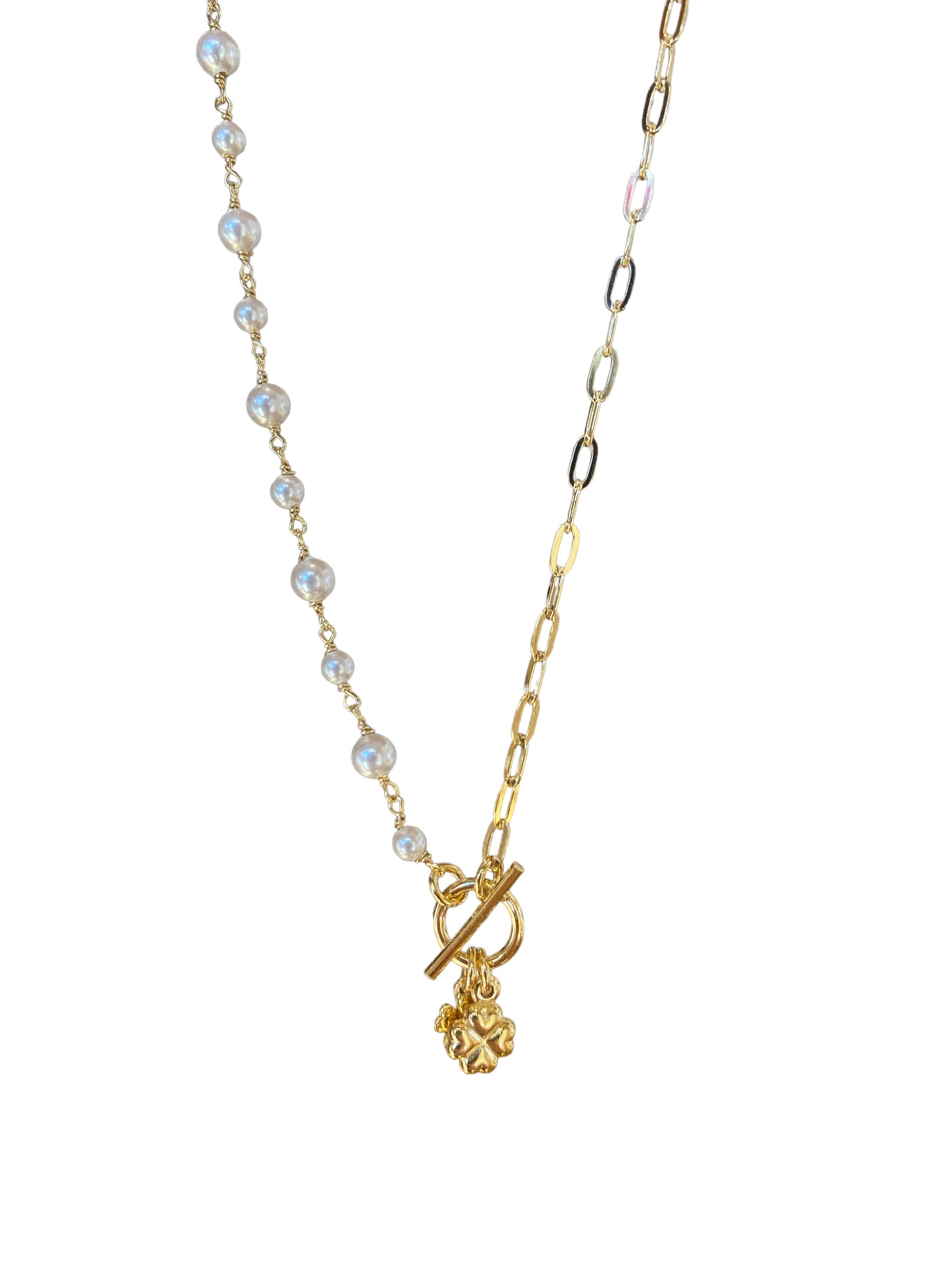 Collana con bagno oro e perline,centrale con doppio quadrifoglio