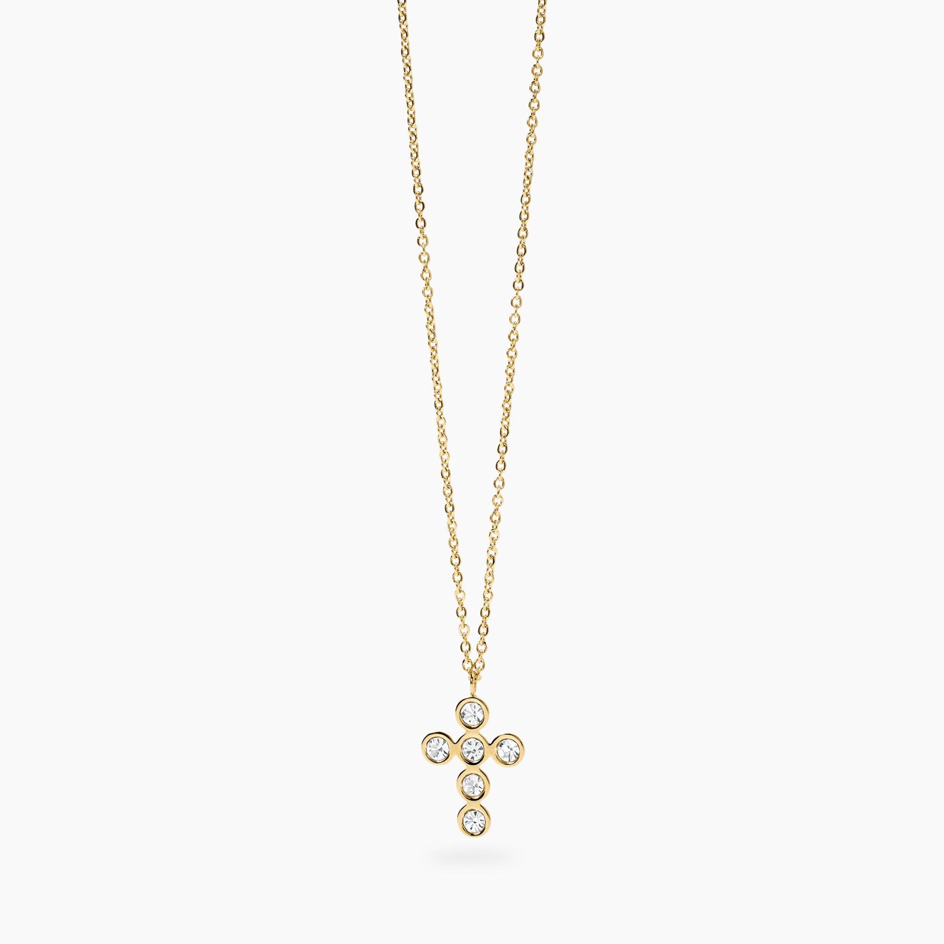Girocollo regolabile in acciaio dorato con catena rolò e pendente croce con cristalli.