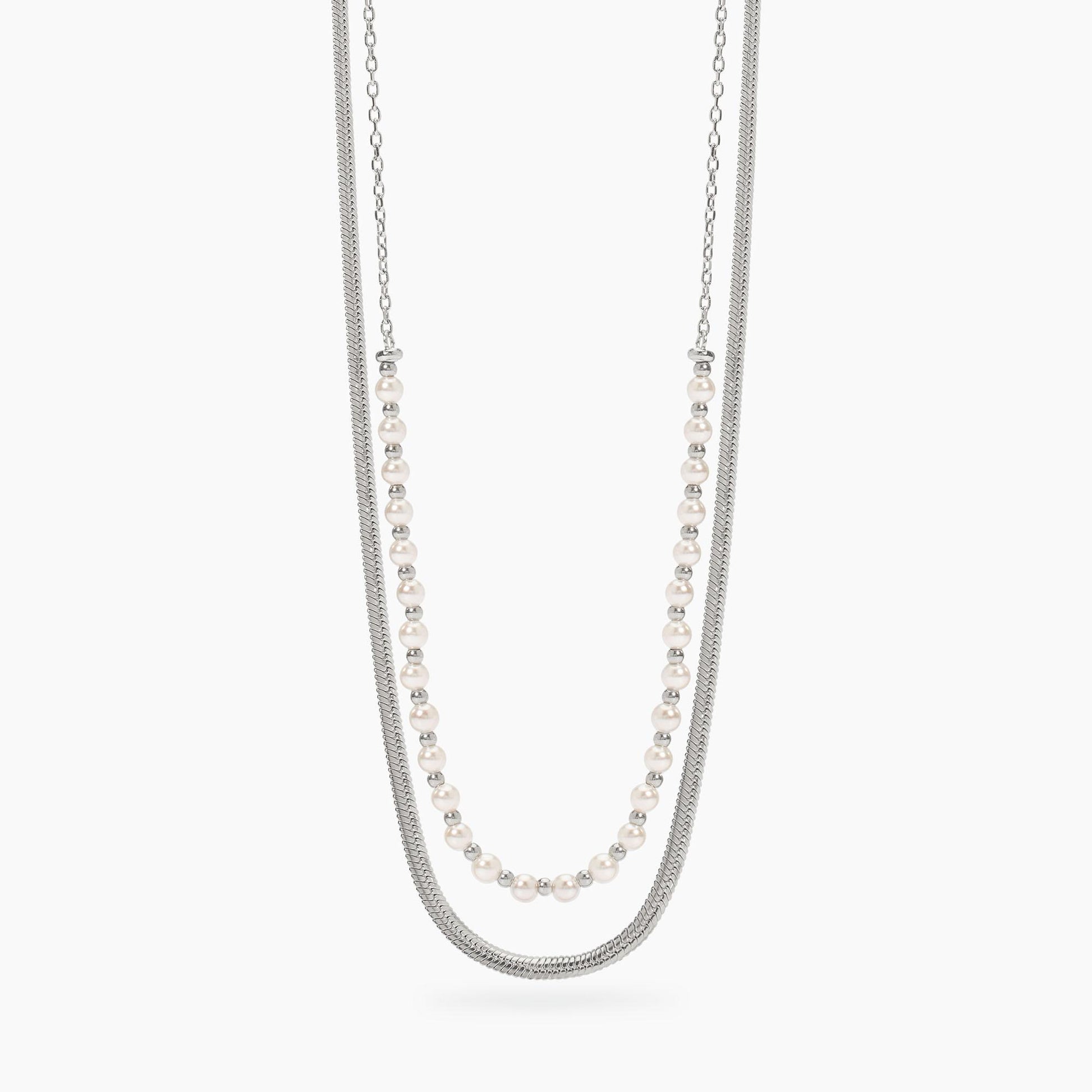 Girocollo regolabile in acciaio con catena snake e rolò con sfere e perle conchiglia.