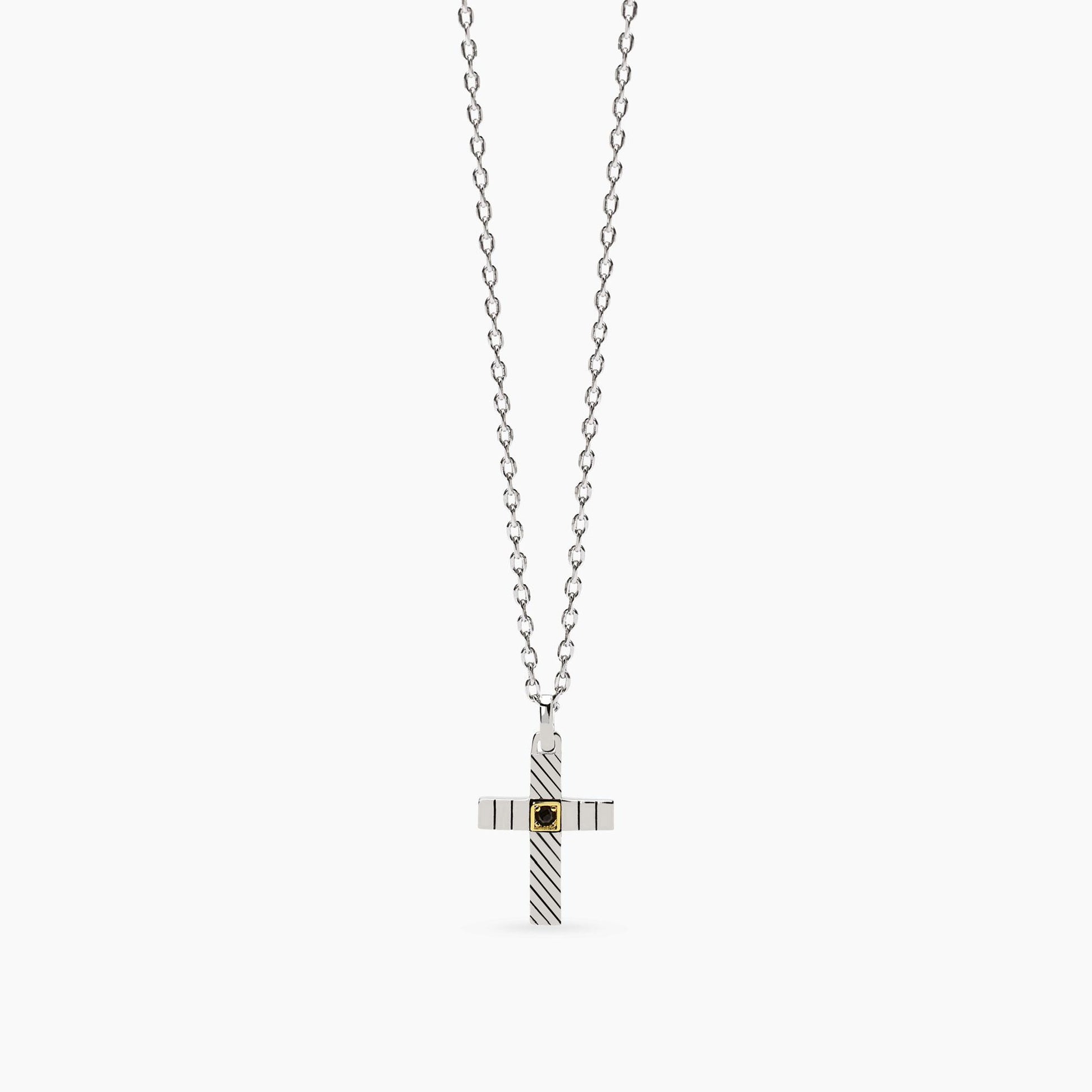 Collana con catena forzatina in argento rodiato e croce lucida con placcatura oro 18K e zircone nero.