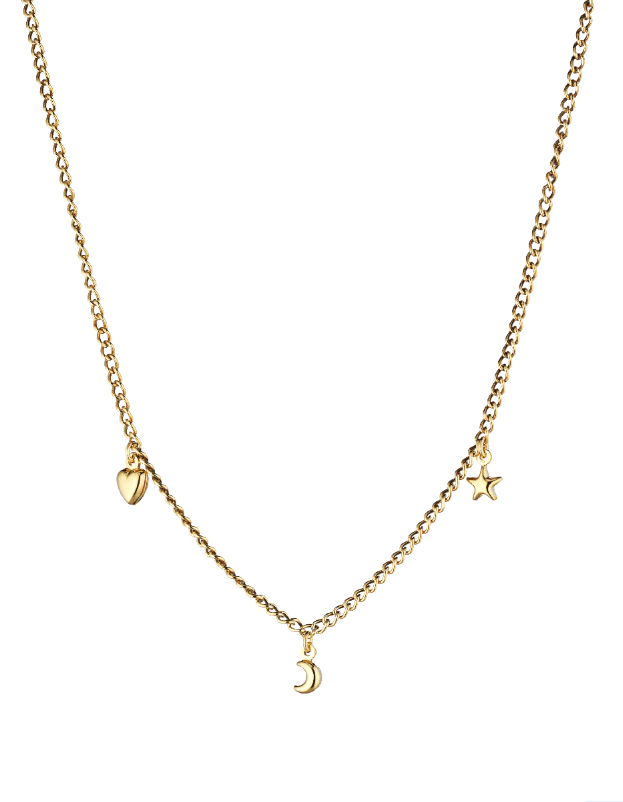 Collana modello girogola in argento 925 con bagno oro e 3 simboli pendenti: stella,luna,cuore.