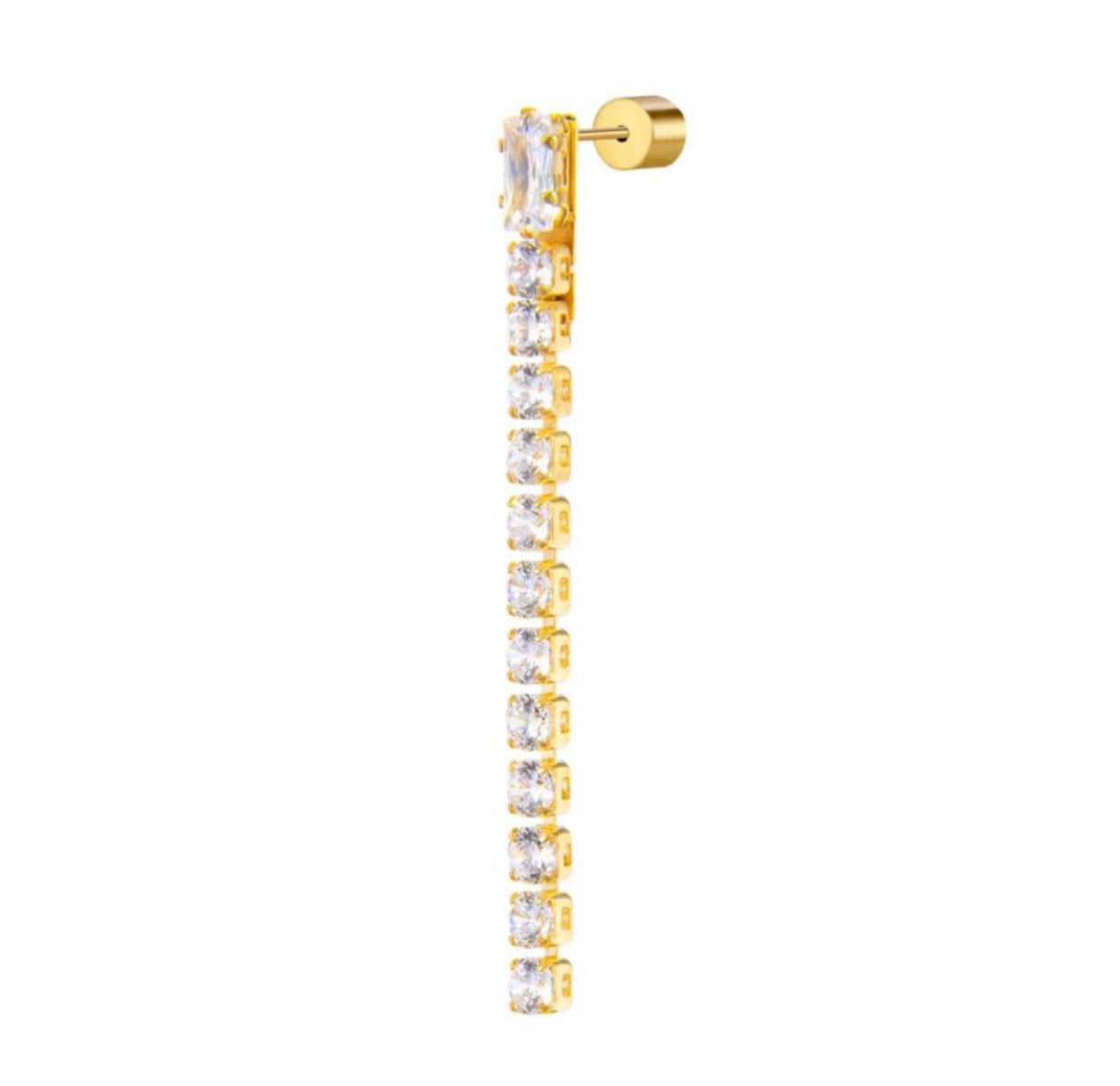 Mono orecchino in acciaio pvd oro con catena tennis con cubic zirconia al cui vertice si trova un cubic zirconia con taglio a baguette. Lunghezza totale 4,6 cm.