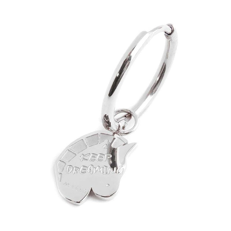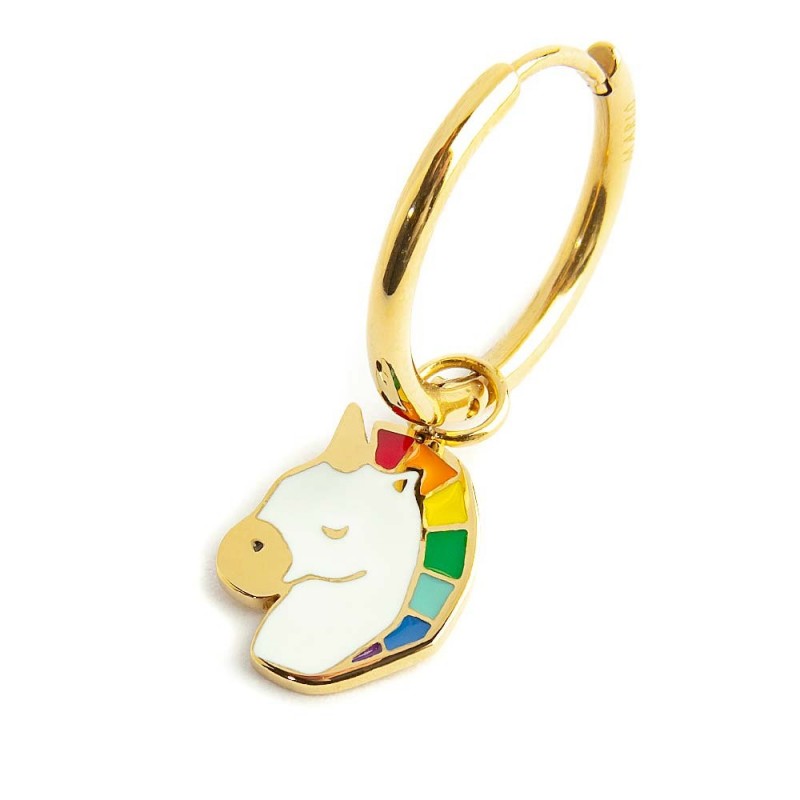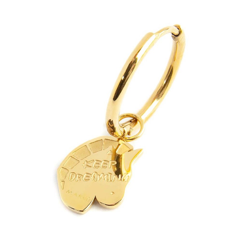 Mono orecchino a cerchio in acciaio/ acciaio pvd oro, con diametro 16 mm, con pendente a forma di unicorno con smalti colorati dimensione 12mm, con inciso sul retro "KEEP DREAMING" e logo Marlù laserato sul retro. Collezione: TMT23 Materiali: acciaio/ acciaio pvd oro, smalto.