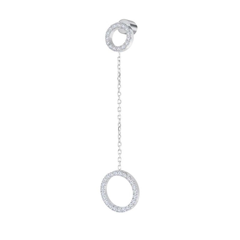 Mono orecchino in acciaio con elemento a cerchio di diametro 0,8 cm con cubic zirconia bianchi con catena cross con pendente elemento a cerchio di diametro 1,2 cm con cubic zirconia bianchi. Lunghezza totale 5,4 cm. Materiali: acciaio, cubic zirconia