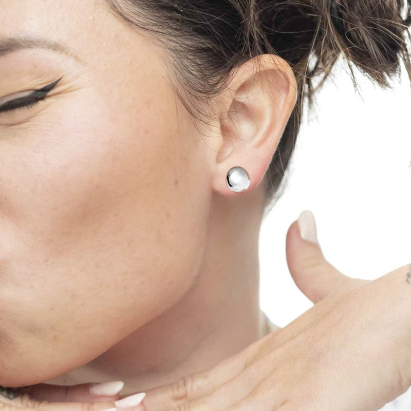 Mono orecchino a lobo in acciaio a bottone con diametro 1,2 cm. Marlù logo laserato sul retro. Materiali: acciaio