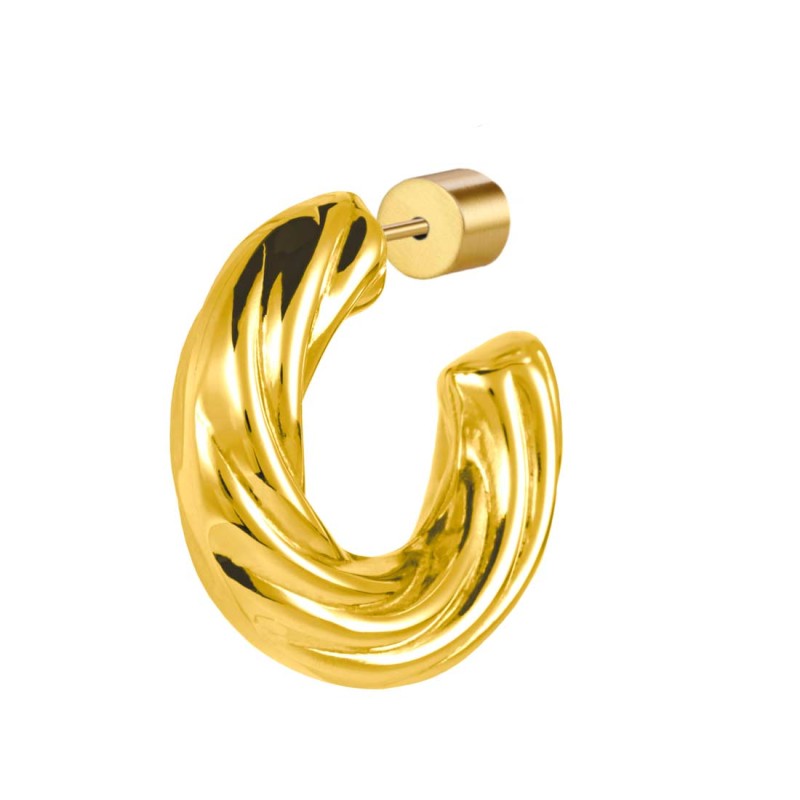 Mono orecchino in acciaio a cerchio aperto con texture, con diametro 2,5 cm, con chiusura aggiuntiva perla rivestita a bottone di diametro 10 mm. Marlù logo laserato sulla parte finale del cerchio. Materiali: acciaio, perla rivestita