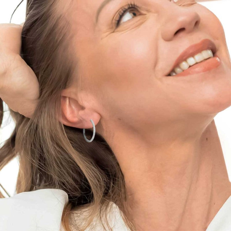 Mono orecchino in acciaio a cerchio 28,50 mm di diametro con cubic zirconia bianchi. Logo Marlù laserato sulla chiusura. Materiali: acciaio, cubic zirconia