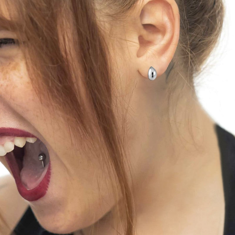 Mono orecchino a lobo in acciaio a forma di goccia con misura 1,1*0,8 cm. Marlù logo laserato sul fondo. Materiali: acciaio