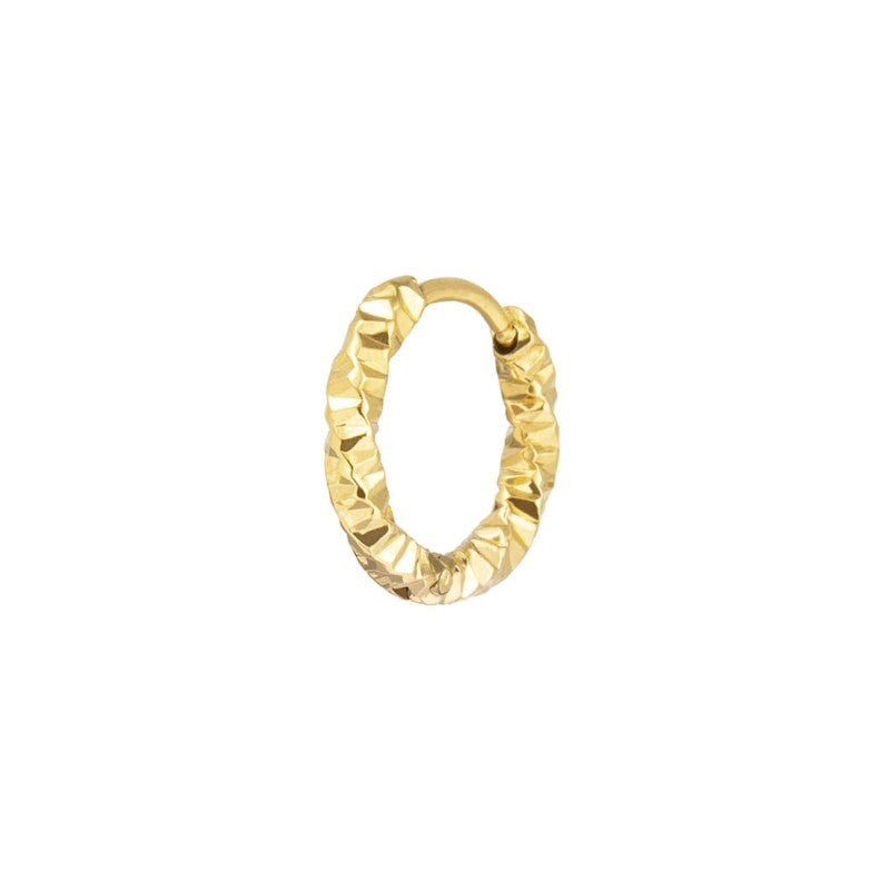 Mono orecchino in acciaio o acciaio con pvd oro a cerchio ritorto con trama diamantata, con diametro 1,5 cm, con chiusura a pressione.