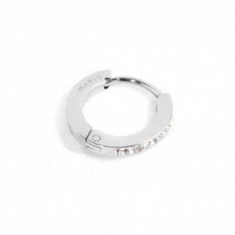 Mono orecchino in acciaio con cristalli, cerchio con diametro 13 mm, chiusura a pressione. Logo Marlù laserato sul lato.