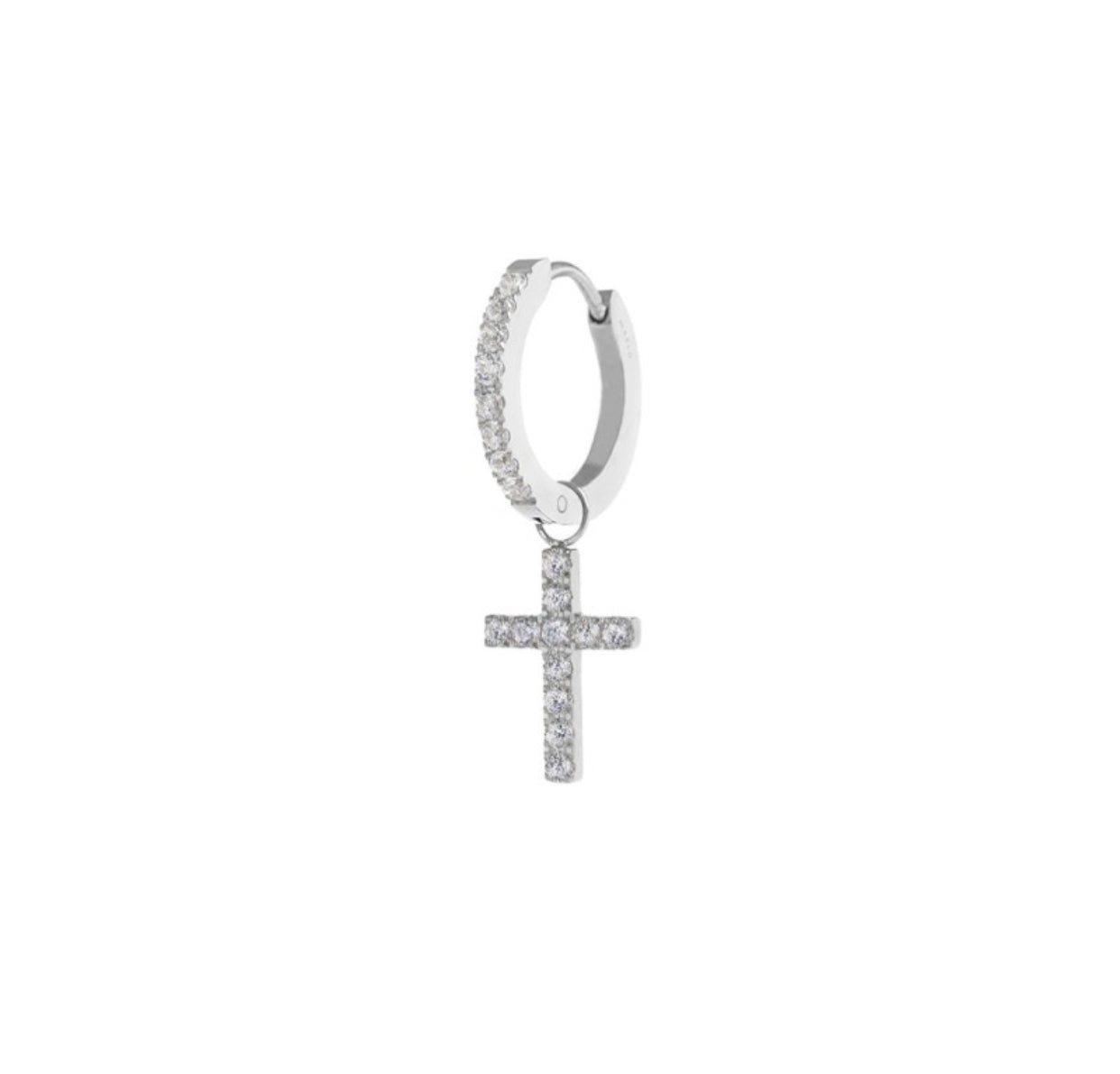 Mono orecchino in acciaio a cerchio con diametro 1,6 cm con cubic zirconia bianchi e pendente a forma di croce con cubic zirconia bianchi. Materiali: acciaio, cubic zirconia
