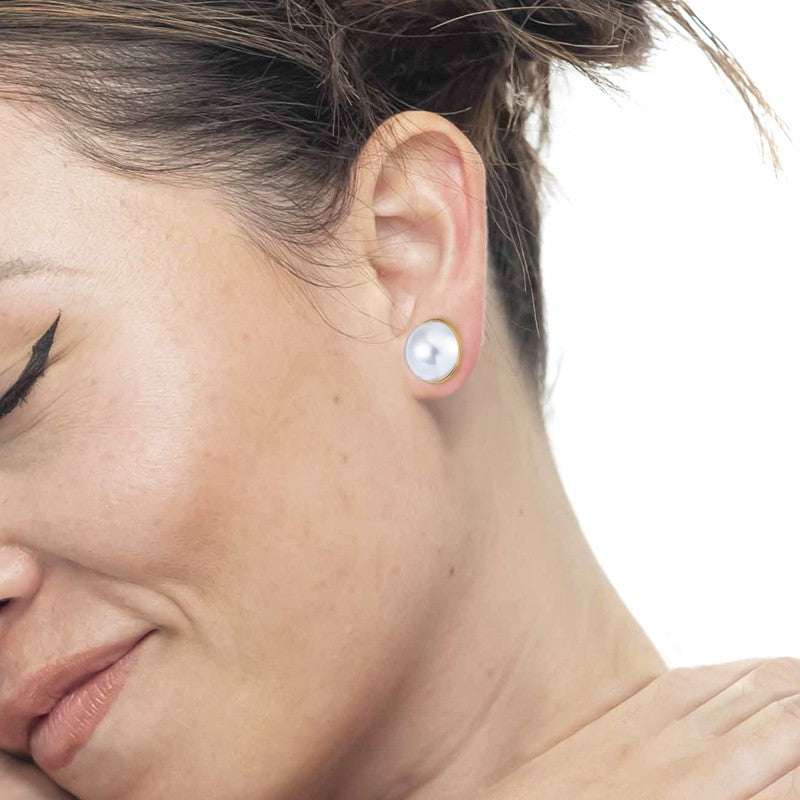 Mono orecchino a lobo in acciaio con diametro 1,5 cm a bottone con mezza perla. Marlù logo laserato sul retro. Materiali: acciaio, perla