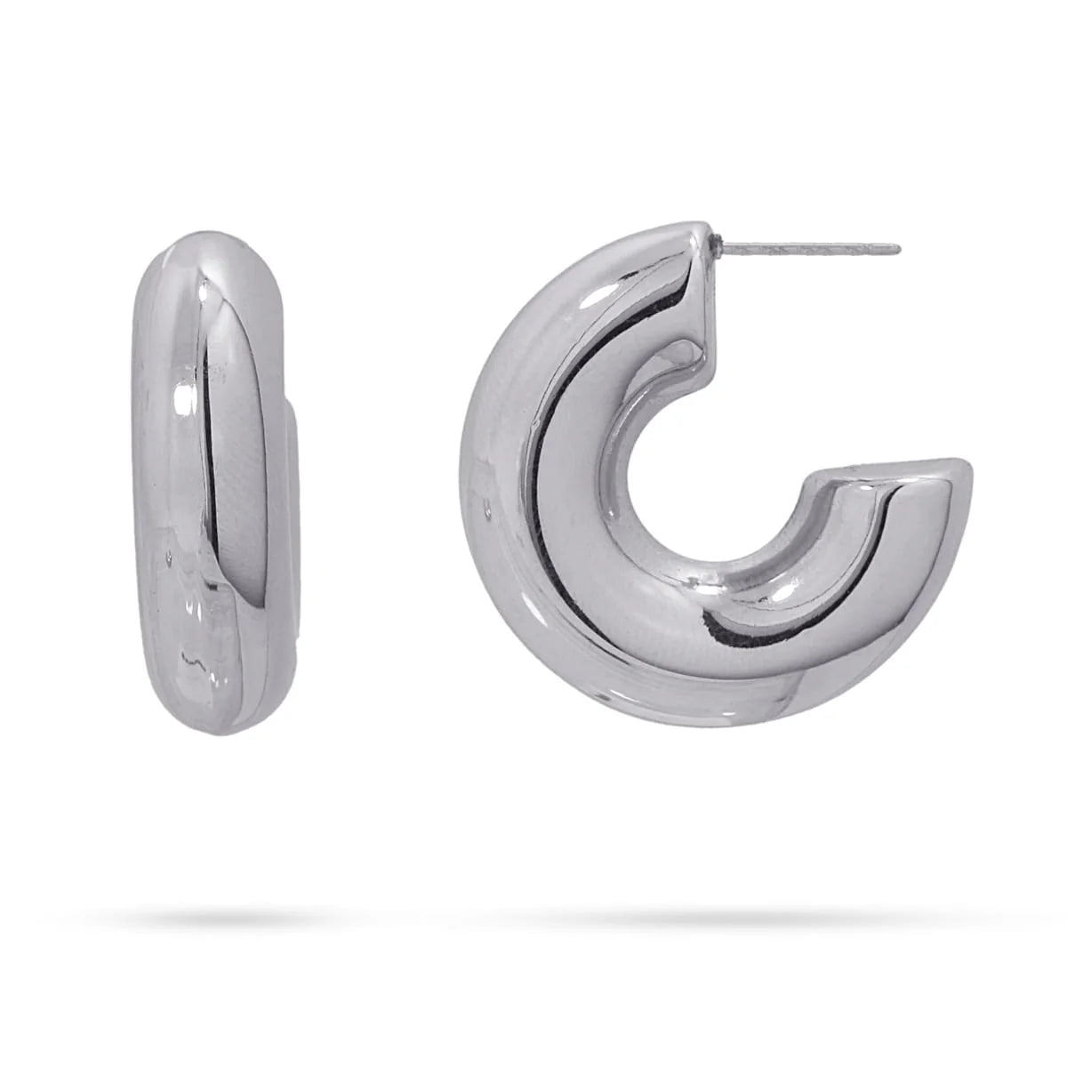 Orecchini a cerchio bombati in acciaio chirurgico e anallergico; presentano chiusura con perno e farfalla.