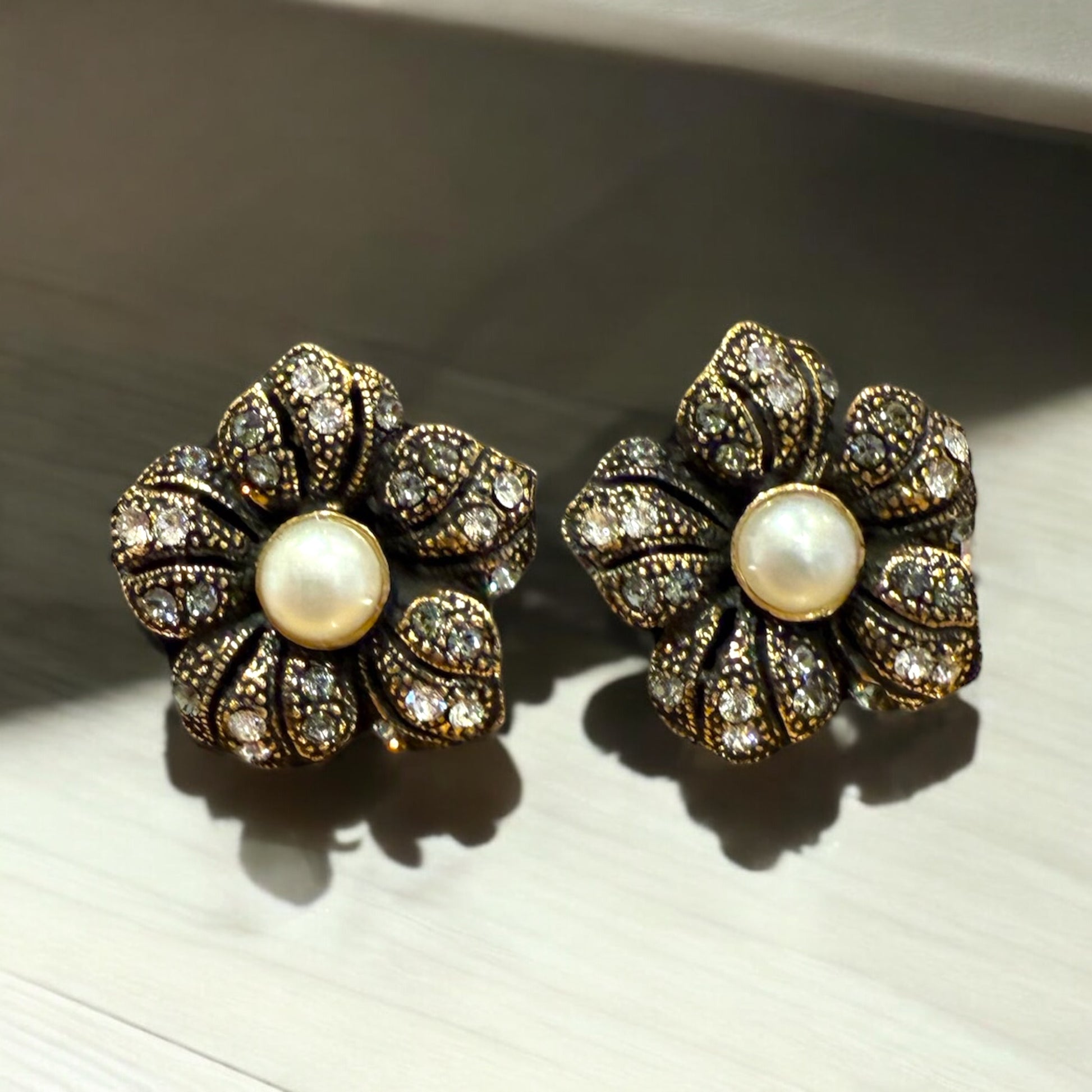 Orecchini a perno, in ottone dorato con fiore in swarovski, perla centrale